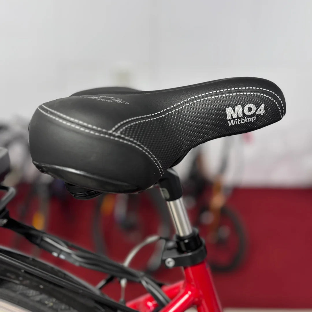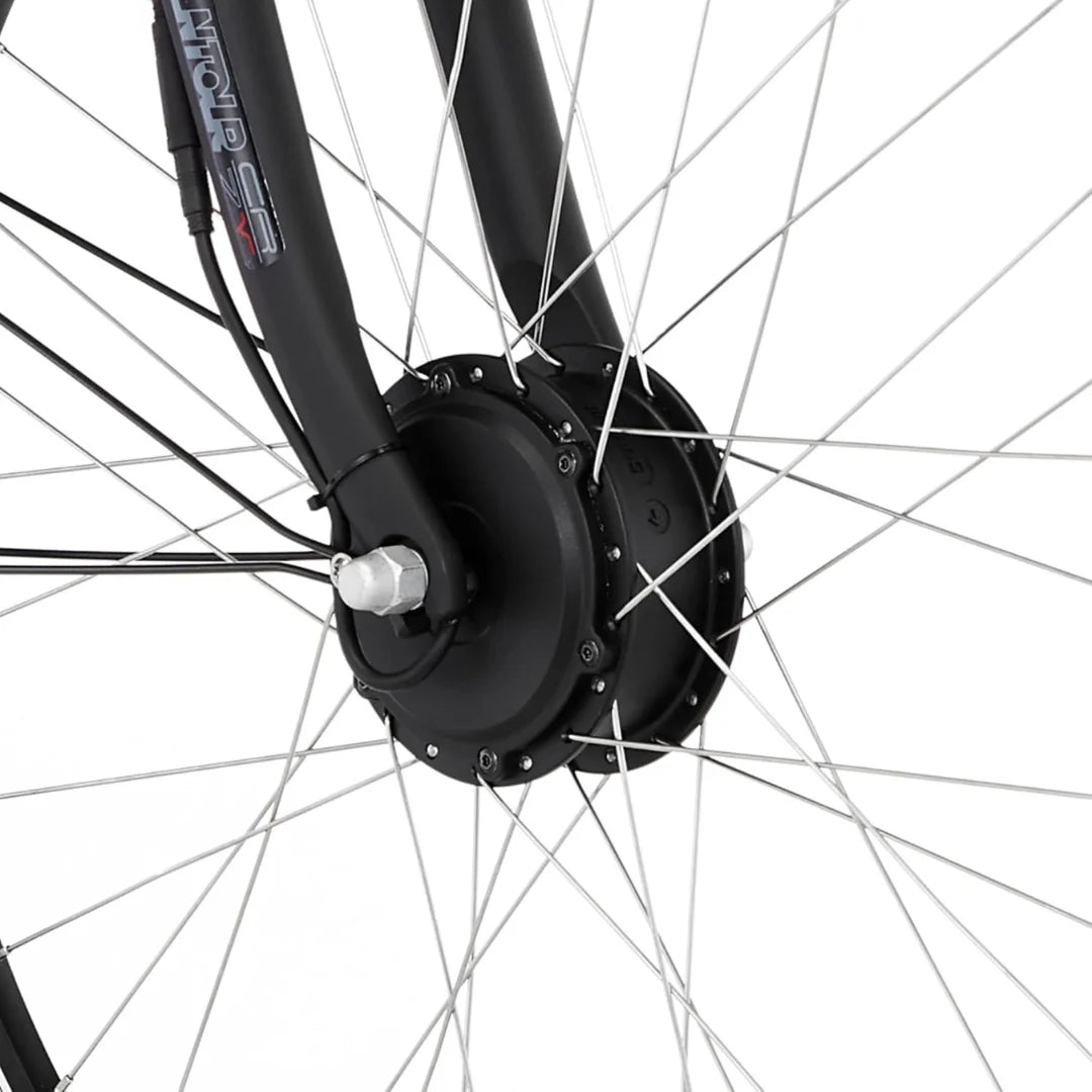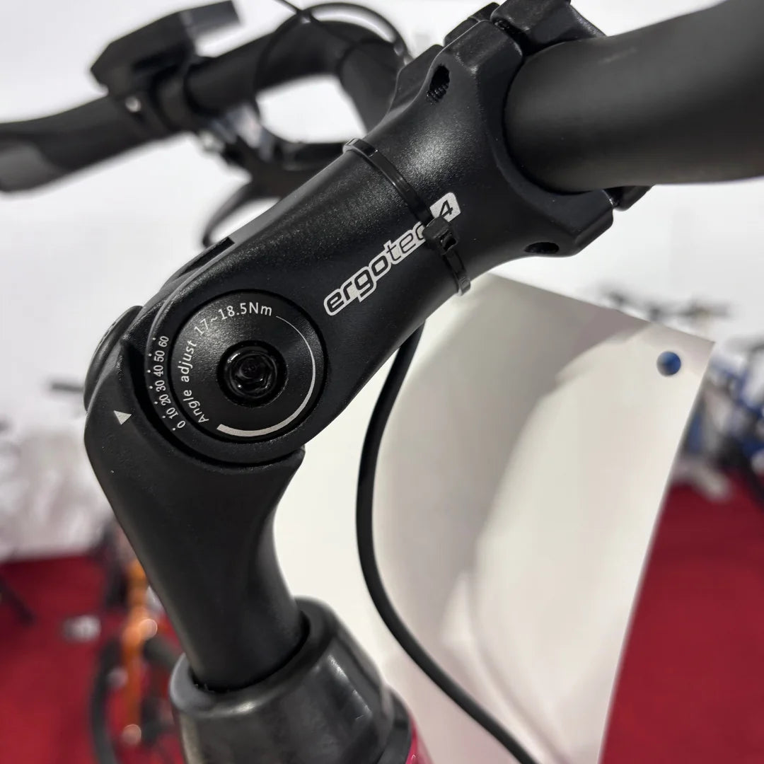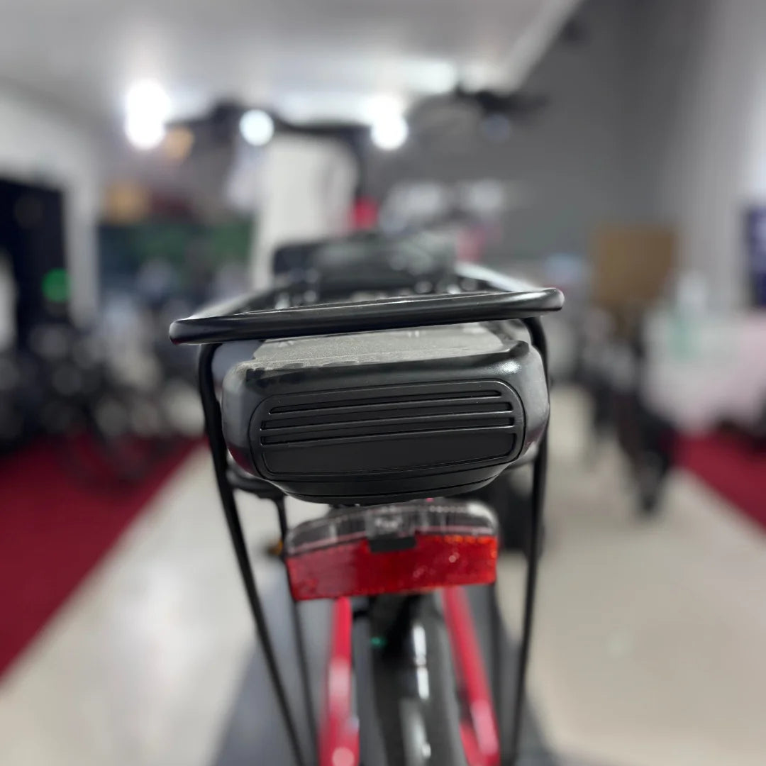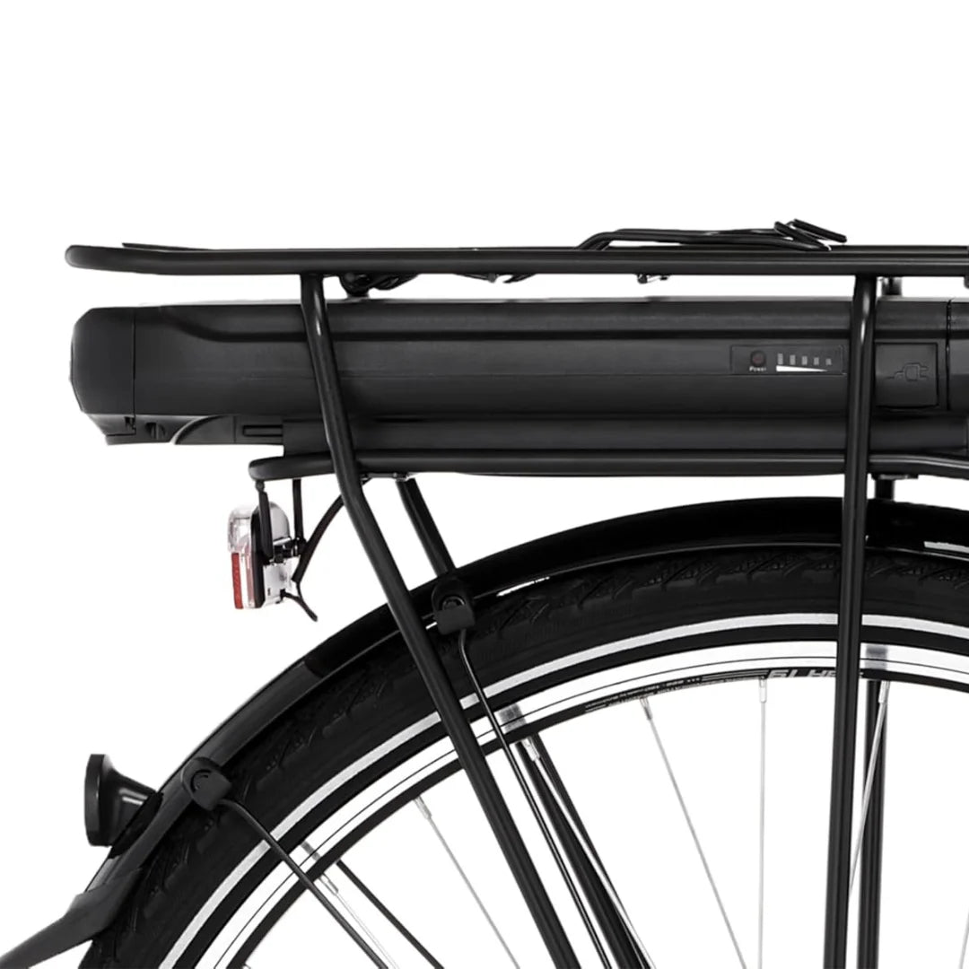 Upright geometry and a low-step aluminum frame make mounting/dismounting effortless. The front suspension and spring-loaded Humpert Ergotec seatpost enhance ride comfort over bumps. The LED display on the Bafang LED 350 CAN Bus control panel keeps interface clean and intuitive. Included accessories—rear rack, integrated frame lock, and reflective tire sidewalls—balance practicality with modern design aesthetics.