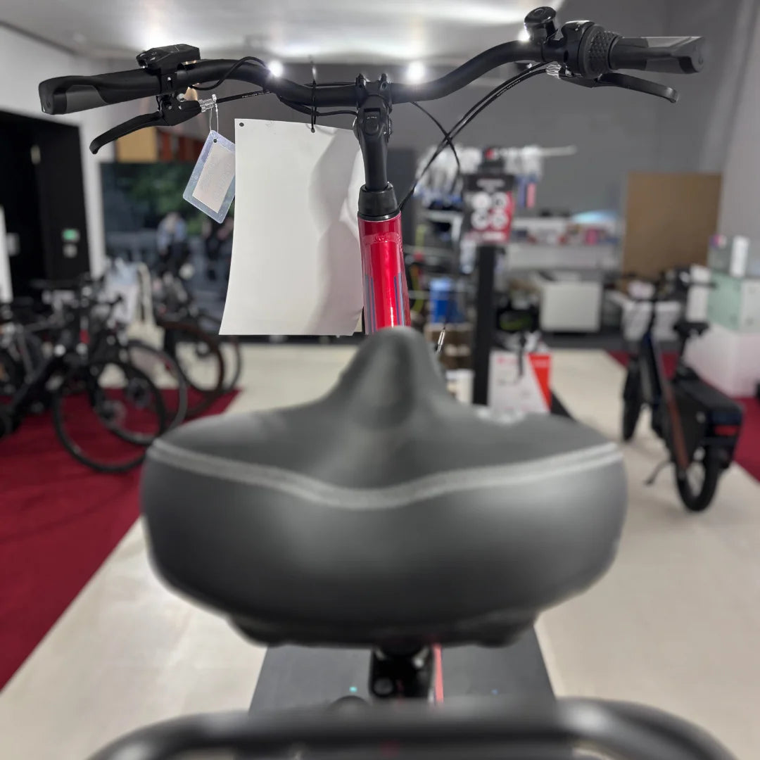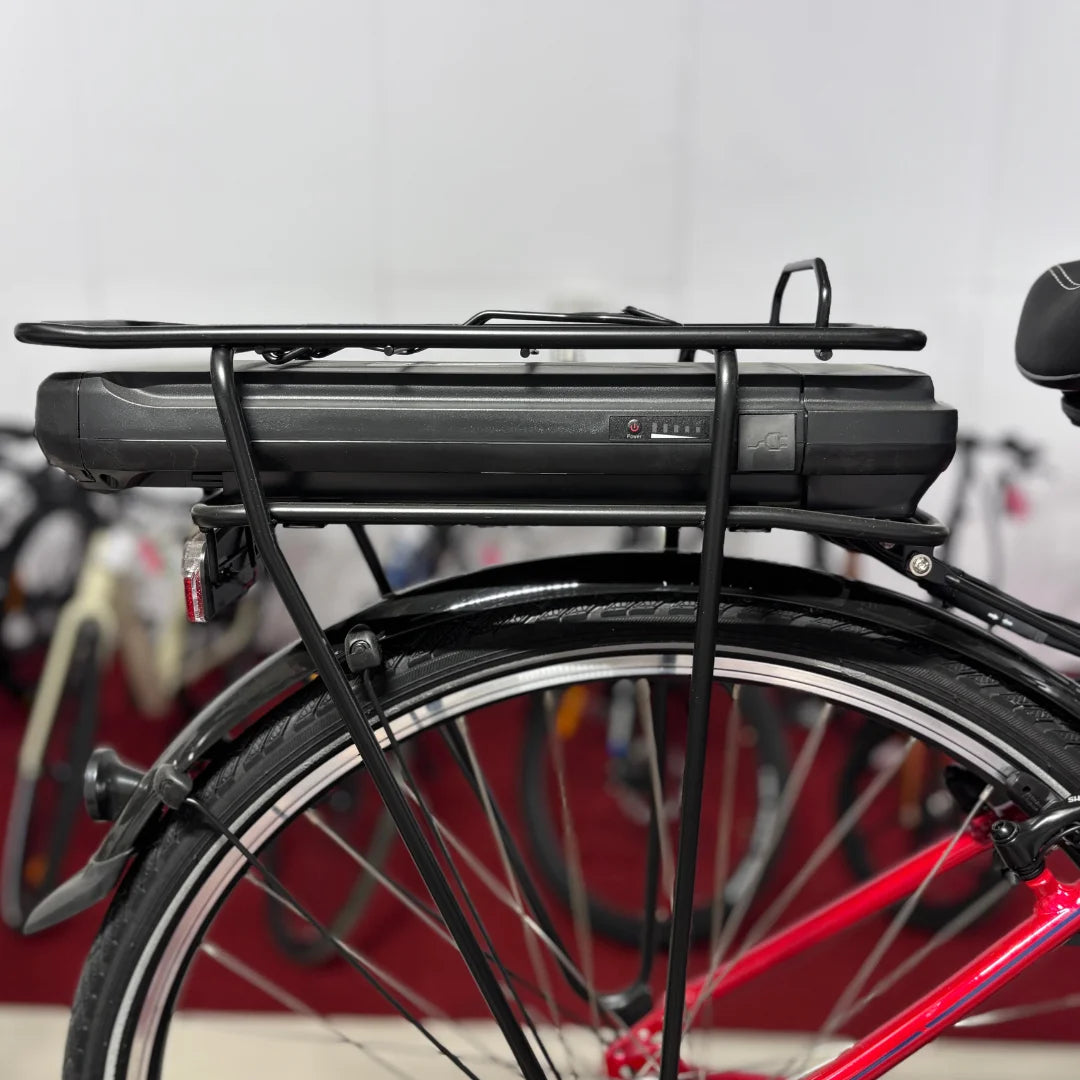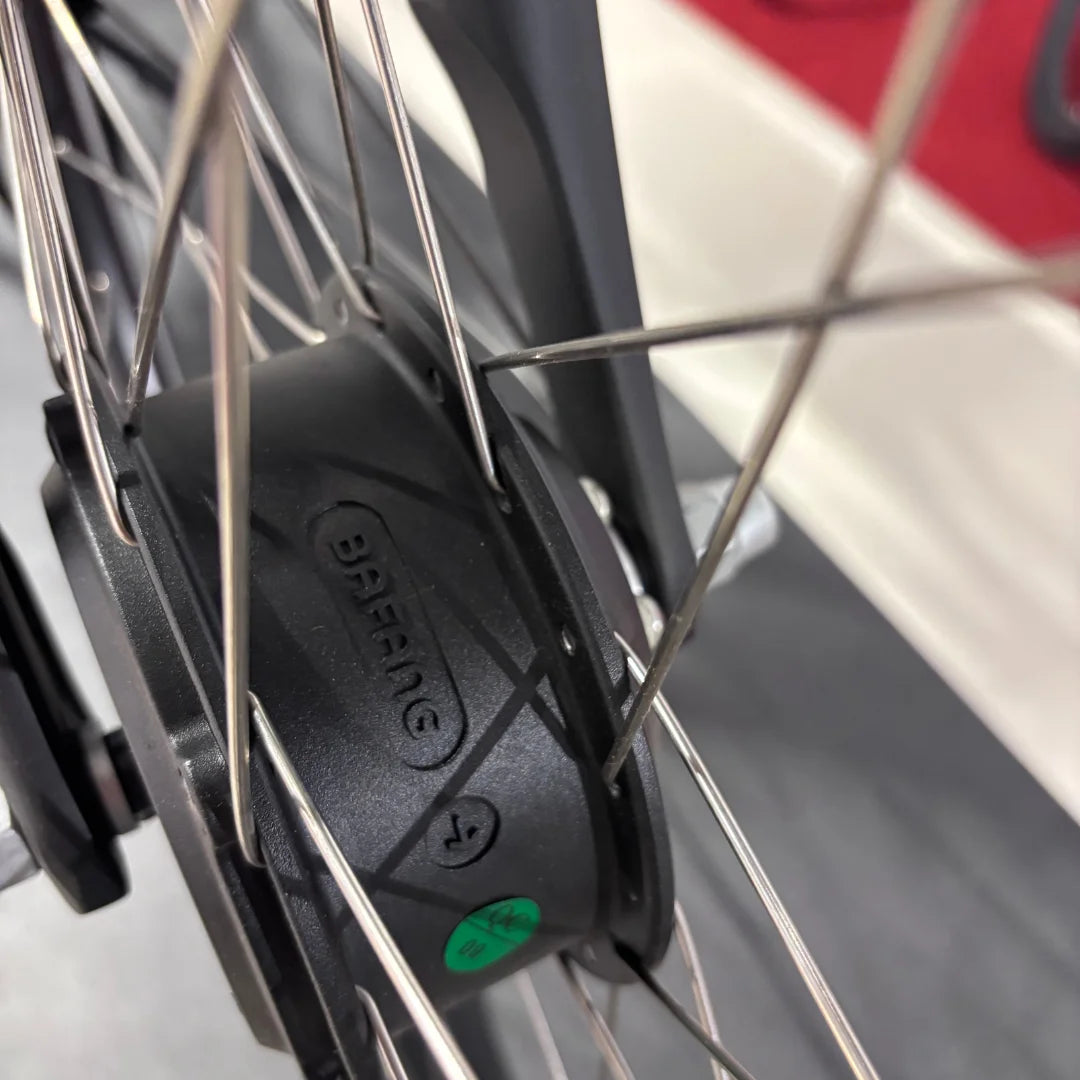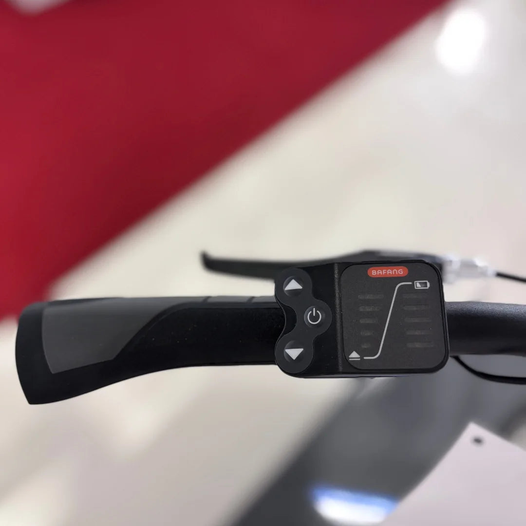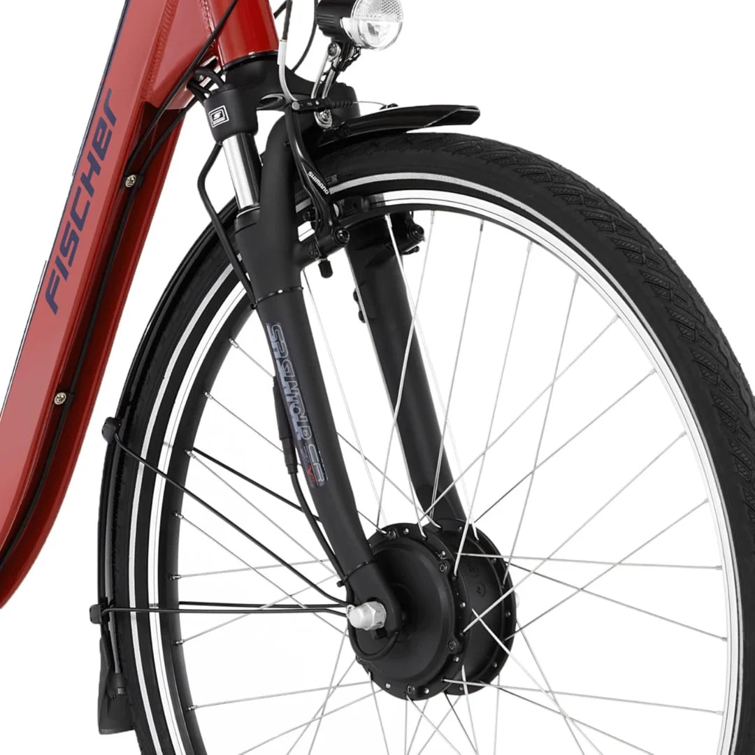 Upright geometry and a low-step aluminum frame make mounting/dismounting effortless. The front suspension and spring-loaded Humpert Ergotec seatpost enhance ride comfort over bumps. The LED display on the Bafang LED 350 CAN Bus control panel keeps interface clean and intuitive. Included accessories—rear rack, integrated frame lock, and reflective tire sidewalls—balance practicality with modern design aesthetics.