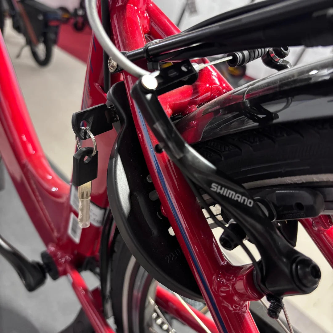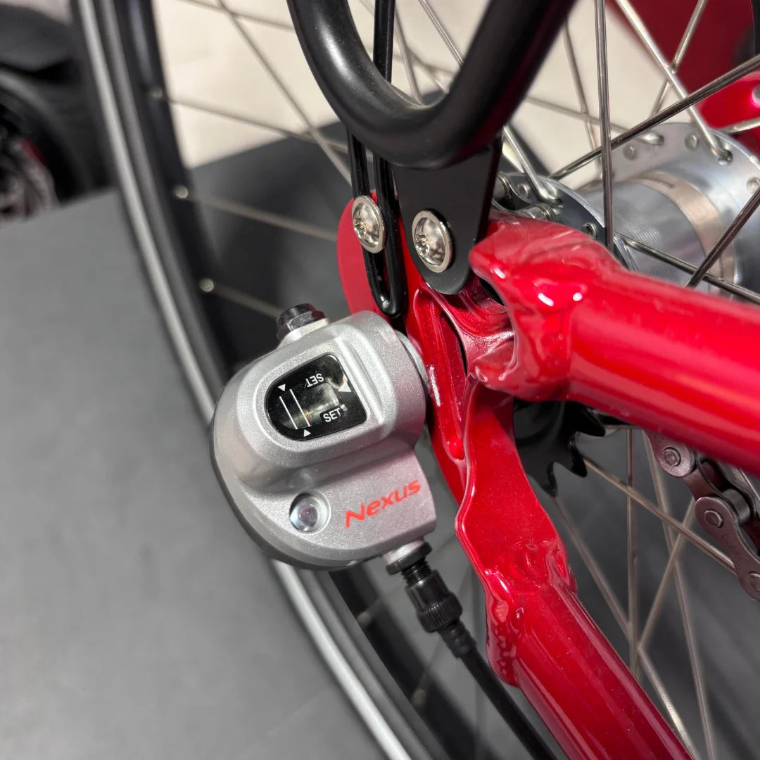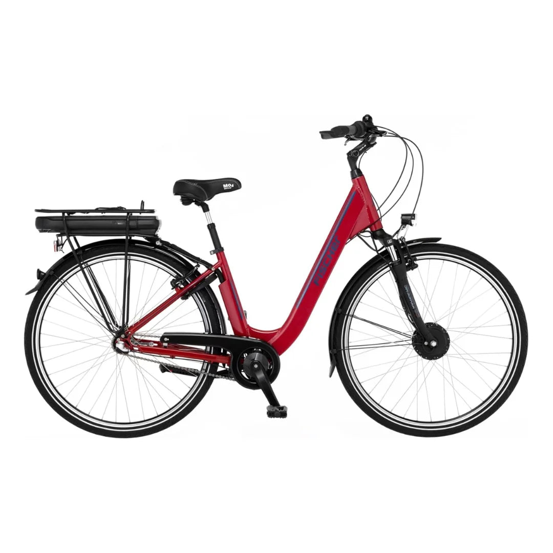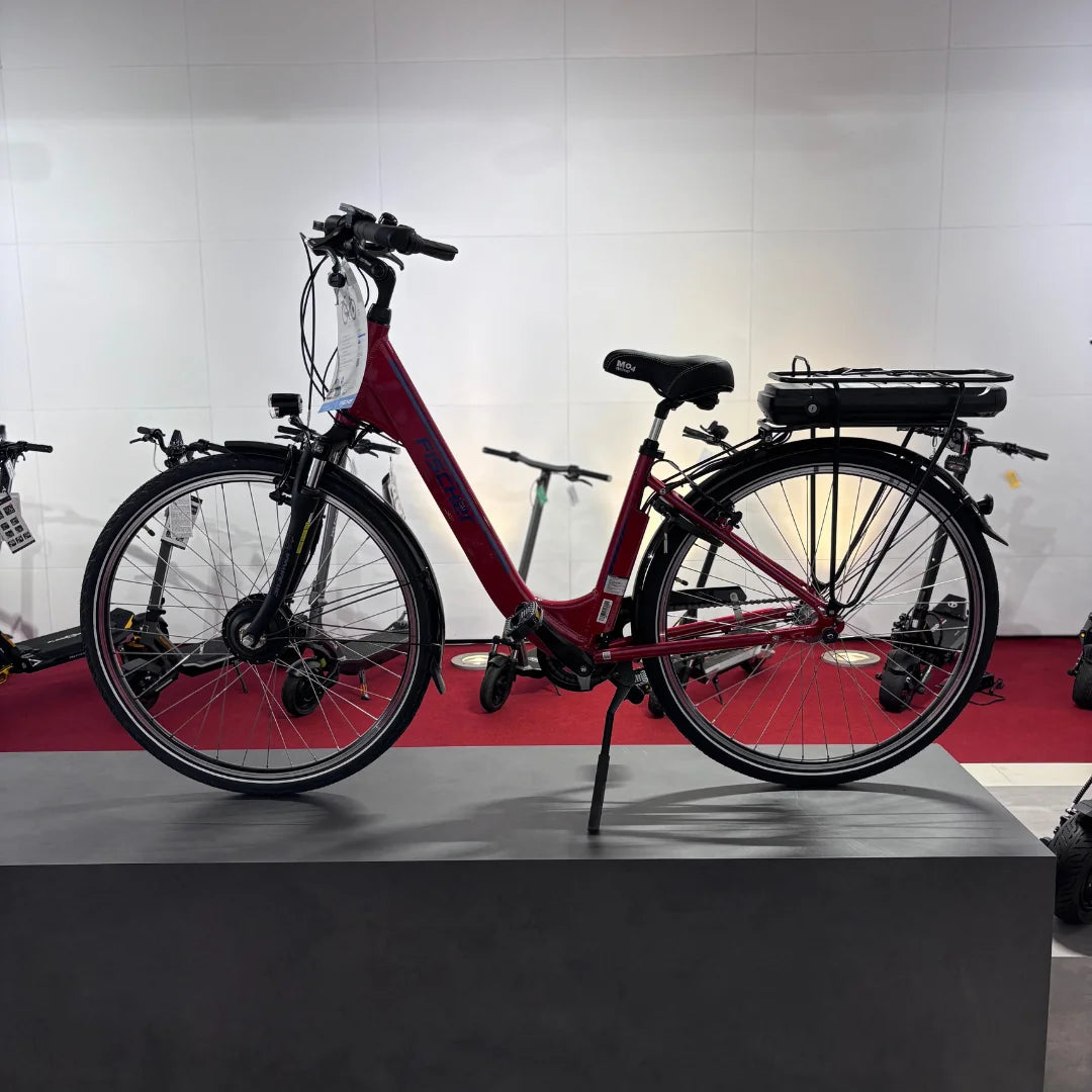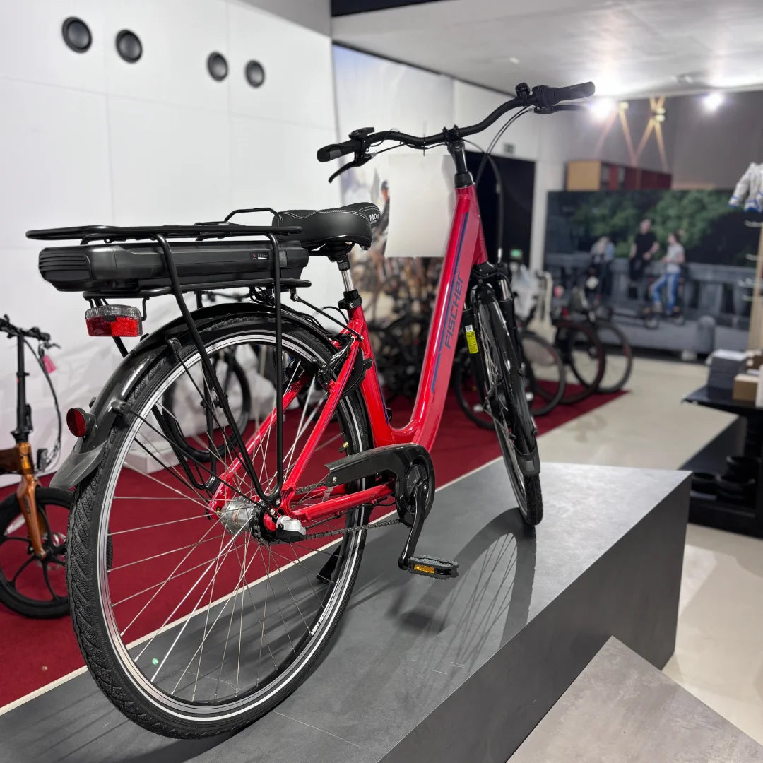 Upright geometry and a low-step aluminum frame make mounting/dismounting effortless. The front suspension and spring-loaded Humpert Ergotec seatpost enhance ride comfort over bumps. The LED display on the Bafang LED 350 CAN Bus control panel keeps interface clean and intuitive. Included accessories—rear rack, integrated frame lock, and reflective tire sidewalls—balance practicality with modern design aesthetics.
