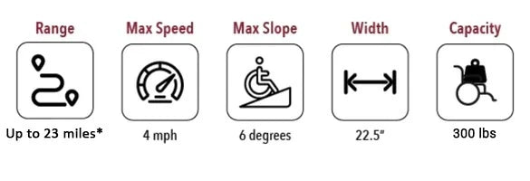 Various battery options are available to suit your range needs. With the more powerful battery configuration (20AH), you can reach a distance of up to 36 km (or up to 28 km with the 12AH version). Batteries can operate simultaneously and be charged either on the wheelchair or independently, ensuring continuous mobility and ease of use.