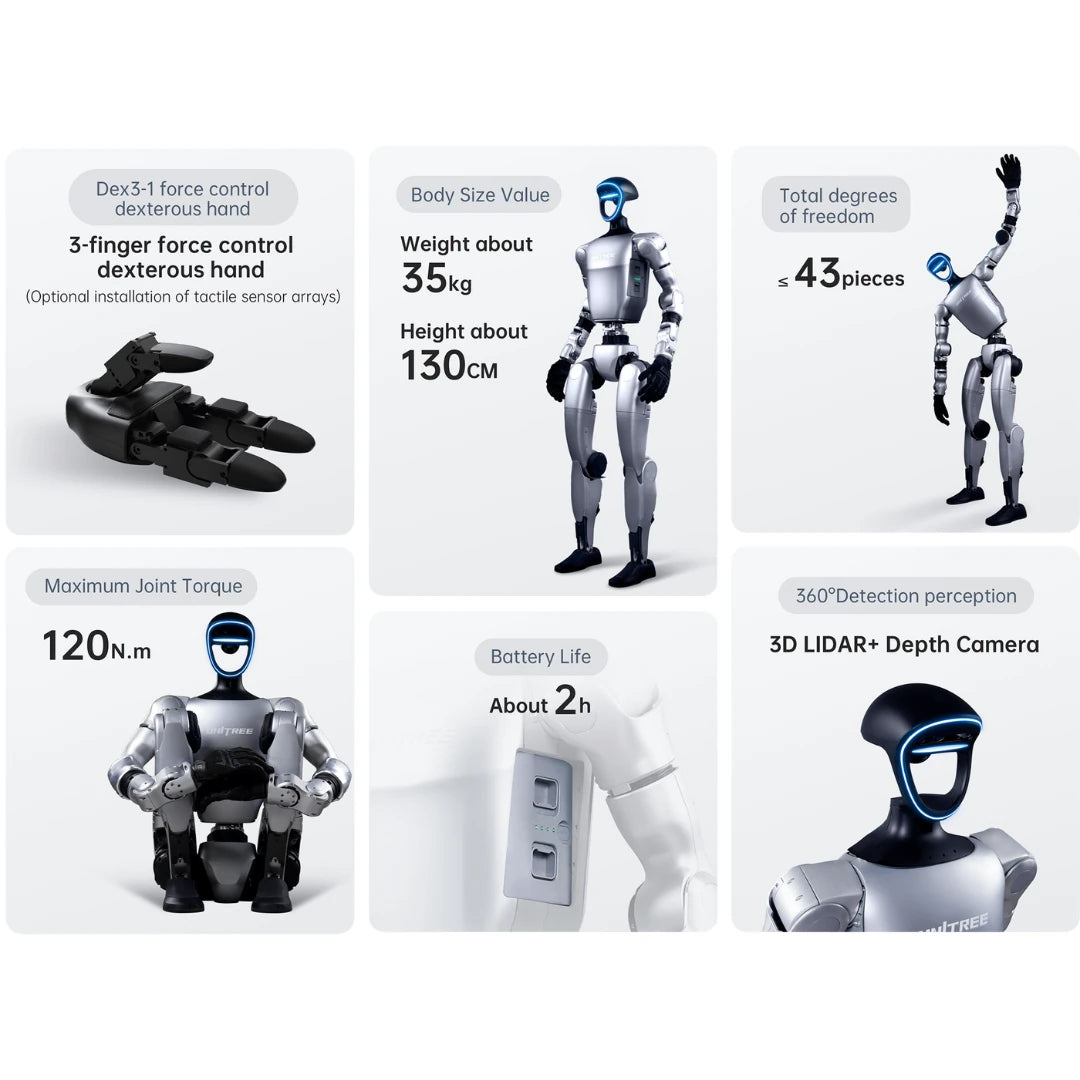 Pri naprednejših konfiguracijah (G1 EDU) je robot opremljen z rokami Dex3-1, ki omogočajo hibridni nadzor sile in položaja. S temi "Force Control" rokami lahko G1 izvaja precizna opravila, kot so odpiranje orehov, spajkanje ali rokovanje z občutljivimi predmeti. Roke simulirajo človeško spretnost in so ključne za raziskave na področju interakcije robot-človek.