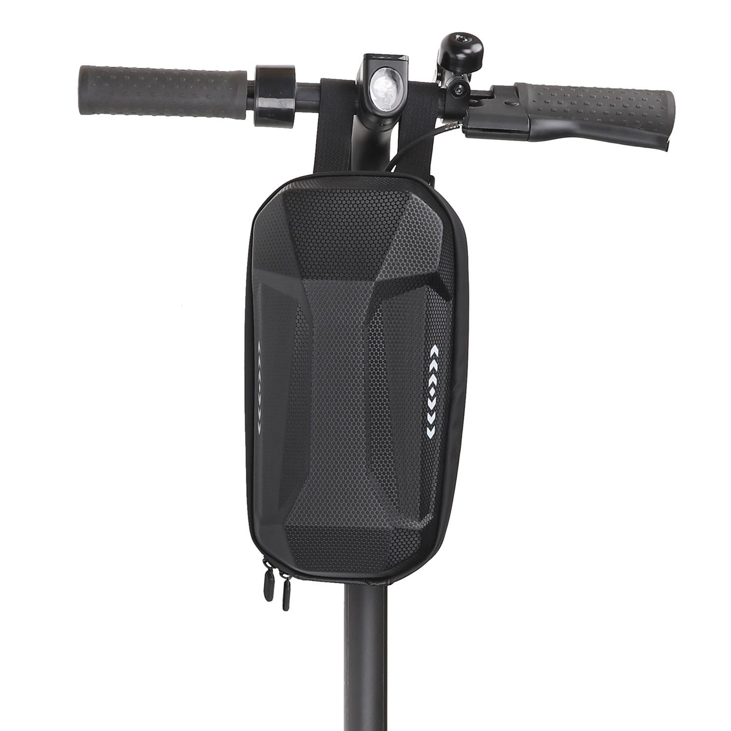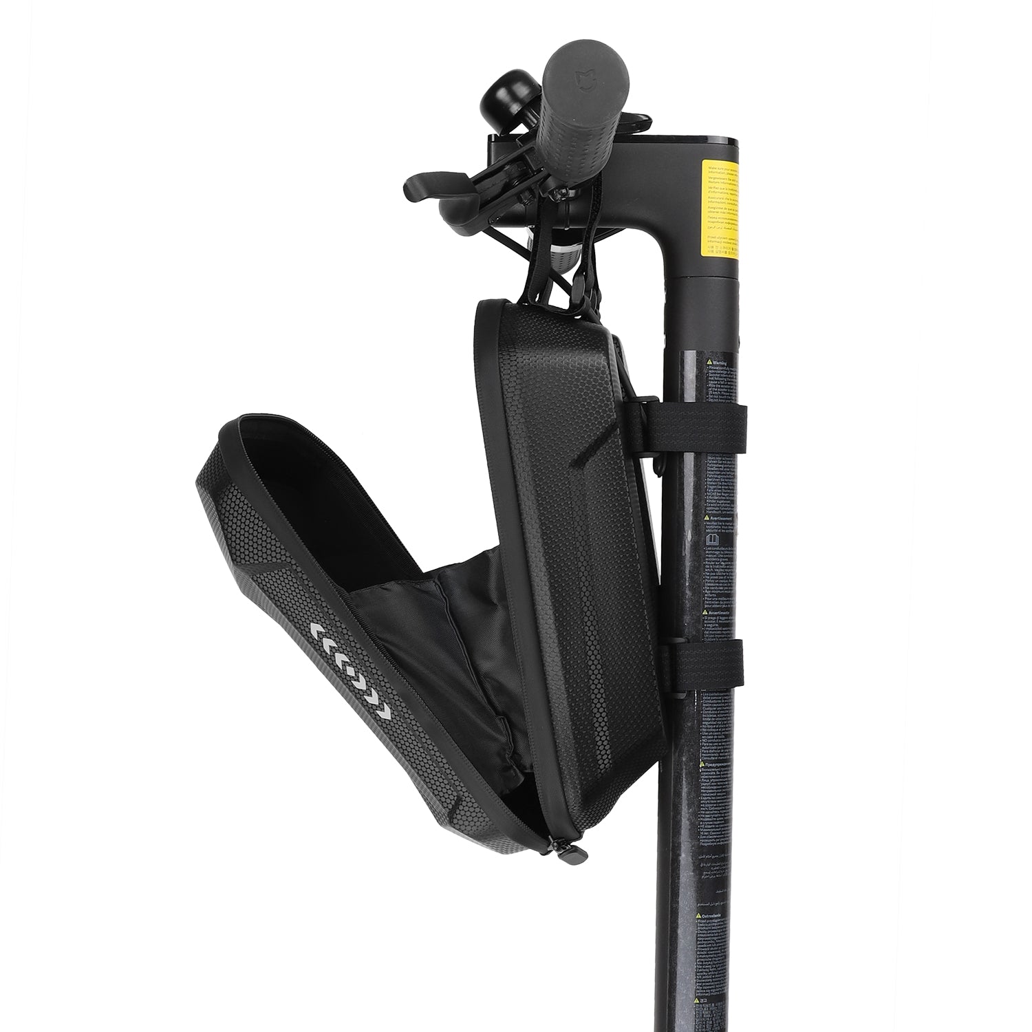 Set of two waterproof front bags (3L + 2L) for electric scooter. Made of EVA and PU material with reflective elements. Mounts on the scooter handlebars. Suitable for Xiaomi, Ninebot, Segway, and other scooters. Practical storage for the charger, tools, and personal items.