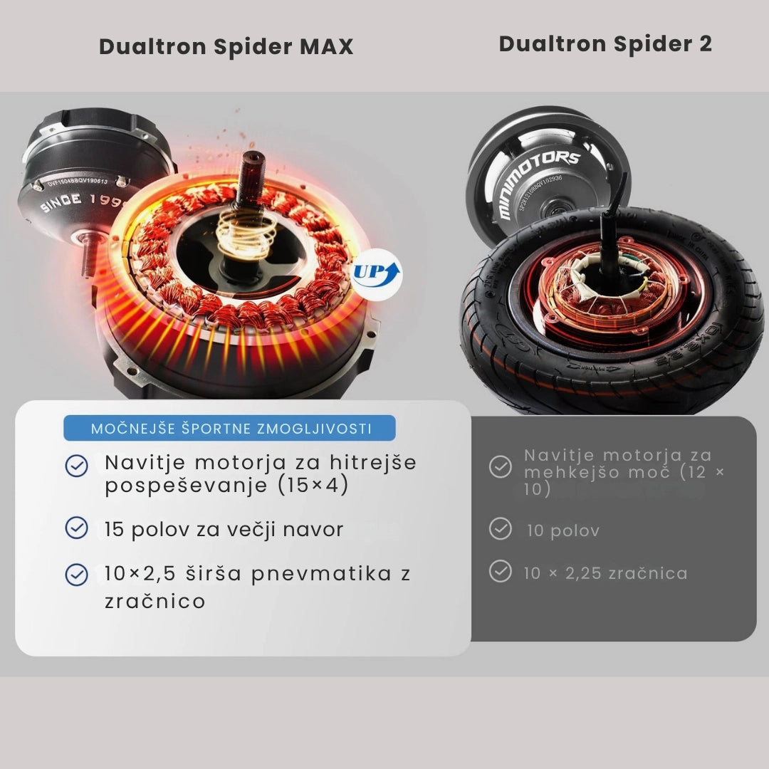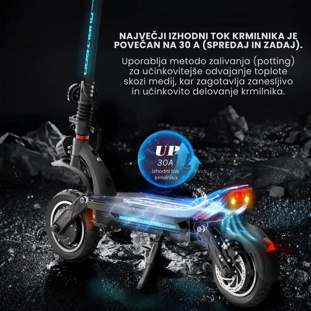Kljub lahki zasnovi Spider Max poganjata dva zmogljiva brezkrtačna motorja s skupno maksimalno močjo 4.000W (2x 1000W nominalno). Ta pogonski sklop zagotavlja bliskovite pospeške, takojšnjo odzivnost in suvereno premagovanje klancev z naklonom do 43% (23°). Vožnja je lahkotna, agilna in dinamična, ne glede na teren.