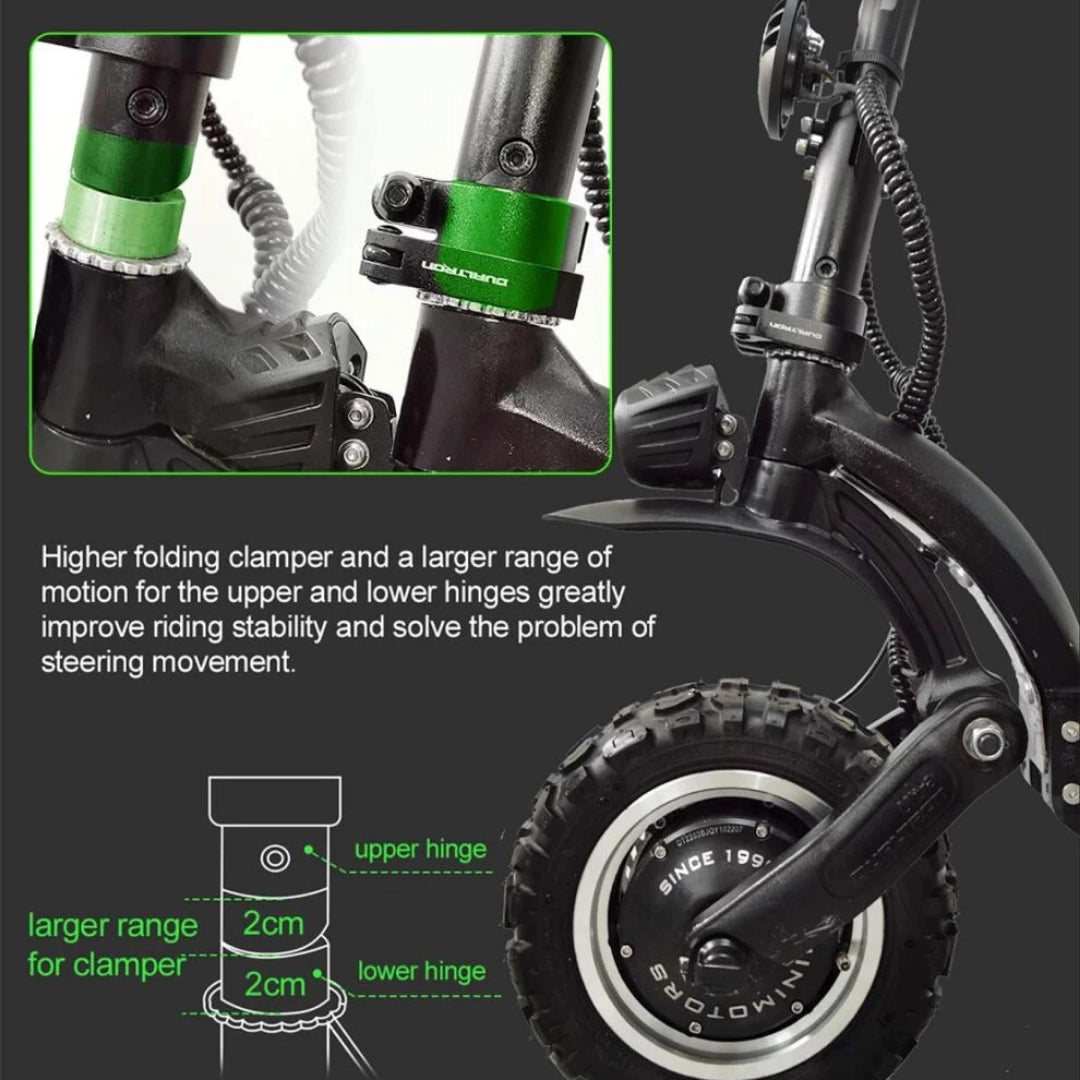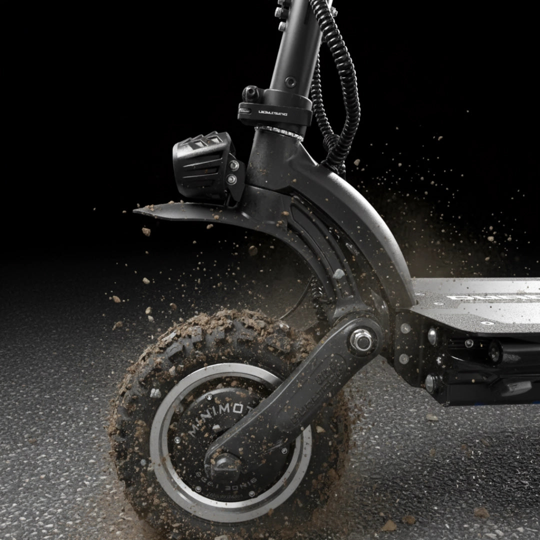 Dualtron Ultra 2 Upgrade je opremljen z velikimi 11-inčnimi terenskimi pnevmatikami, ki zagotavljajo odličen oprijem in stabilnost na neravnih površinah. Ojačano sprednje in zadnje elastomersko vzmetenje učinkovito absorbira tresljaje in zagotavlja gladko vožnjo tudi pri visokih hitrostih na zahtevnem terenu.