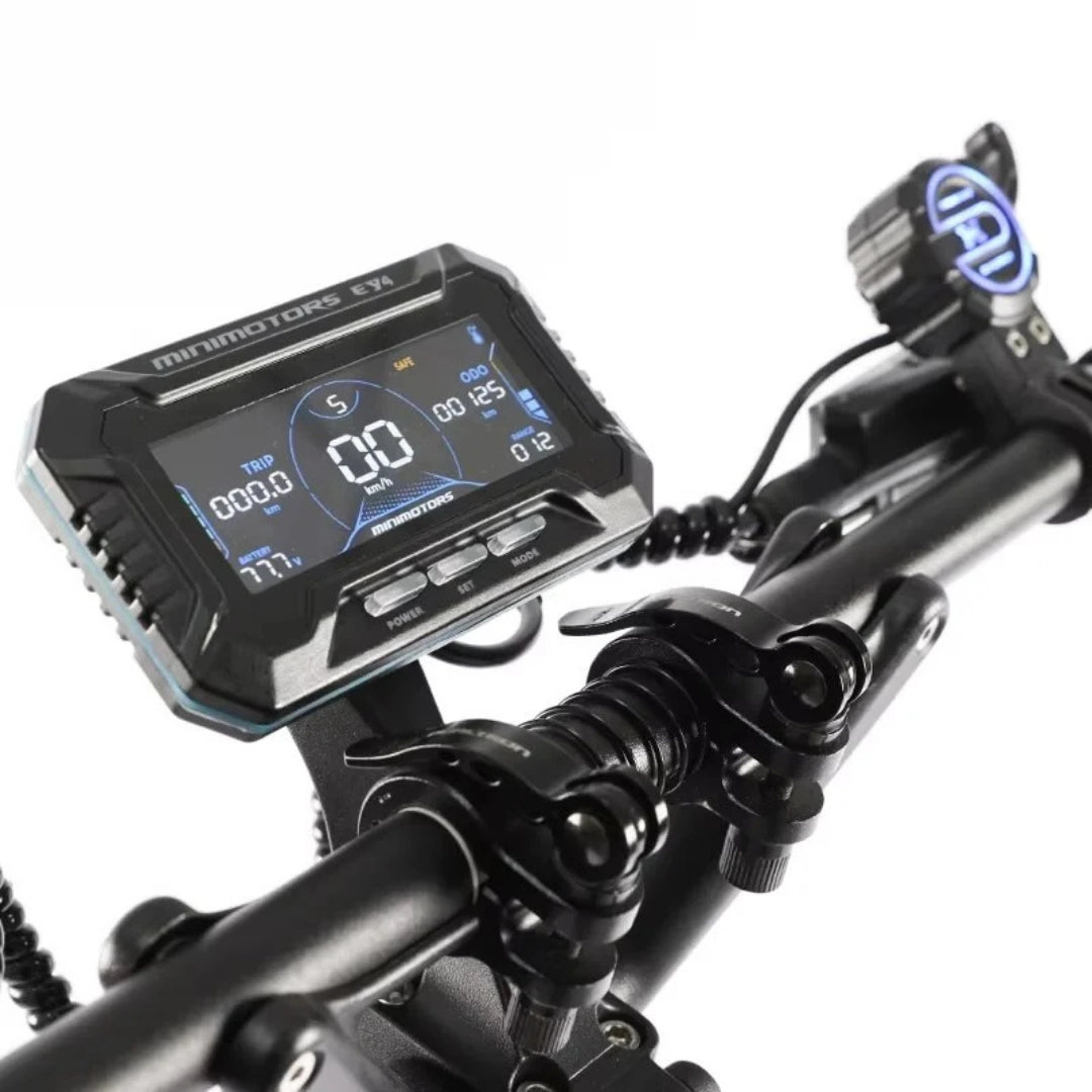 Model je opremljen z velikim in preglednim zaslonom EY4, ki prikazuje vse ključne informacije: hitrost, prevoženo pot, stanje baterije in izbran način vožnje. Preko Bluetooth povezave ga lahko povežete z aplikacijo Dualtron na vašem pametnem telefonu in prilagodite nastavitve delovanja, kot so načini vožnje, tempomat in barva LED osvetlitve.