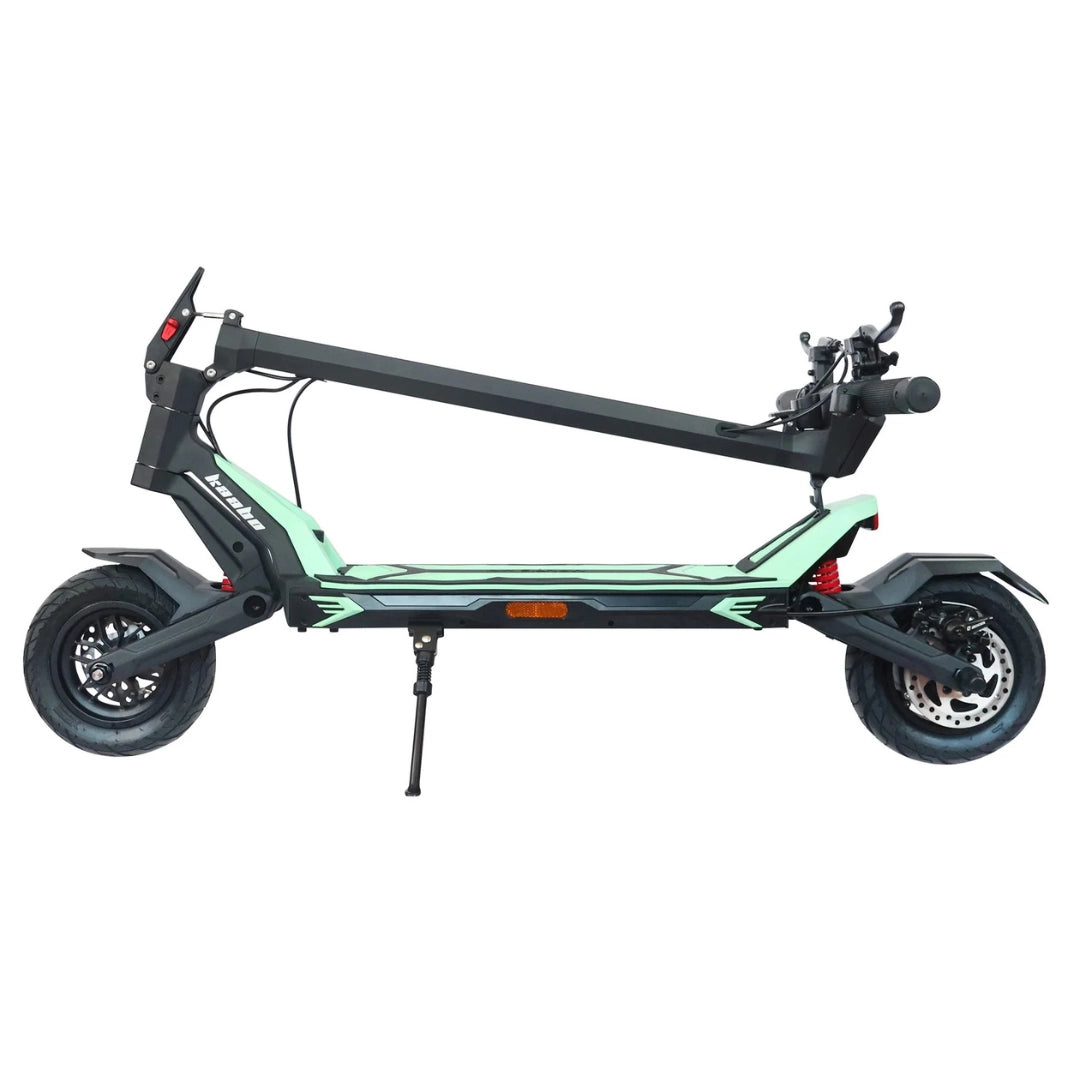 Kaabo Mantis Urban je opremljen s prepoznavnim sprednjim in zadnjim nastavljivim vzmetenjem v obliki črke C. Ta napredni sistem učinkovito absorbira tresljaje z neravnih površin, kot so razpoke na pločnikih in tlakovci, ter zagotavlja izjemno gladko in udobno vožnjo. Visoka oddaljenost od tal (16 cm) dodatno pripomore k varni vožnji čez robnike in druge mestne ovire.