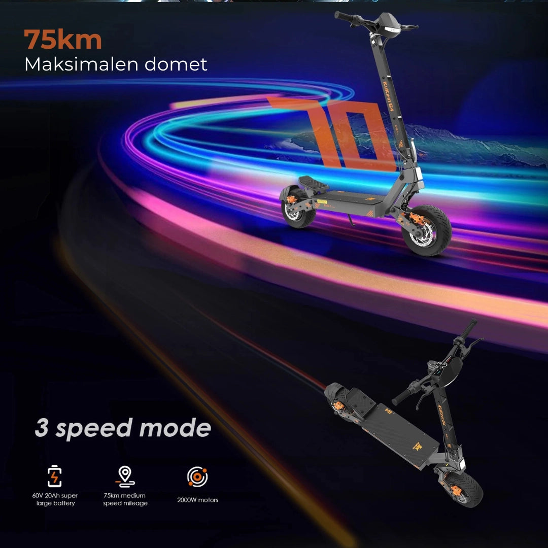 Srce skiroja KuKirin G4 je izjemno močan 2000W brezkrtačni motor, ki zagotavlja osupljive pospeške in navor 38 N.m. Ta surova moč vam omogoča, da z lahkoto premagujete klance z naklonom do 20°. Na voljo so trije načini hitrosti, ki vam omogočajo prilagajanje vožnje glede na teren in vaše želje, s čimer boste vedno imeli popoln nadzor nad vožnjo.