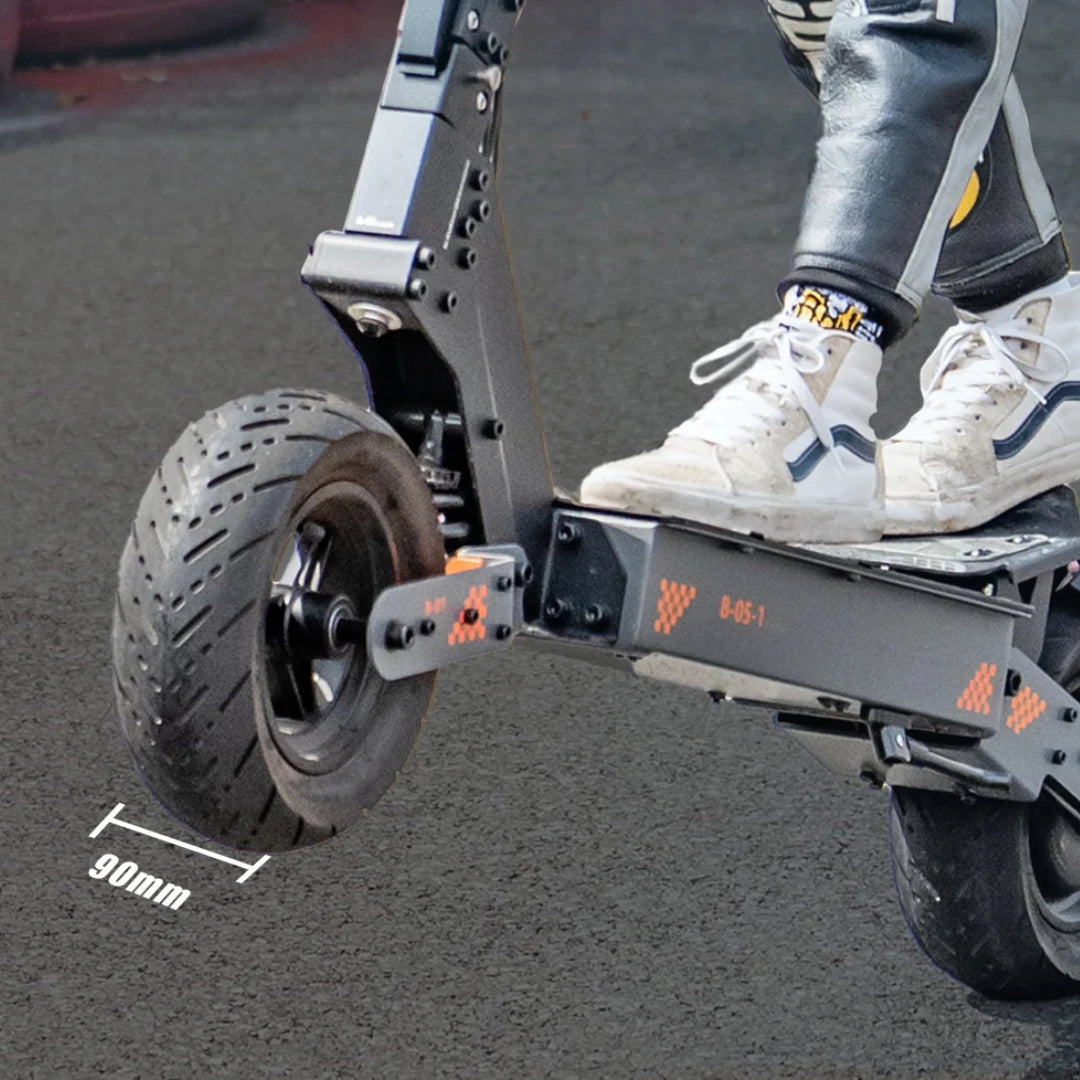 Za zanesljiv stik s podlago skrbijo 11-inčne pnevmatske terenske pnevmatike. Z izjemno širino 90 mm nudijo odličen oprijem in stabilnost na različnih površinah, od asfalta do makadama. V kombinaciji z zmogljivimi sprednjimi in zadnjimi disk zavorami, ki omogočajo varno ustavljanje z zavorno potjo do 4 metre, je vaša varnost vedno na prvem mestu.
