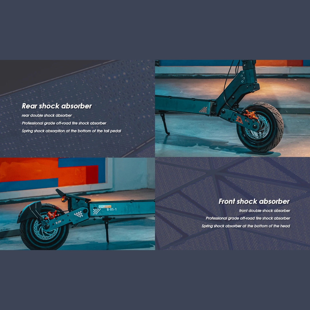 KuKirin G4 je ustvarjen za udobje na vsaki podlagi. Opremljen je s profesionalnim štiritočkovnim sistemom vzmetenja. Sprednji in zadnji dvojni blažilniki učinkovito absorbirajo udarce in vibracije z neravnih terenov, kar zagotavlja izjemno gladko in stabilno vožnjo, ne glede na to, kje vas pot zanese.