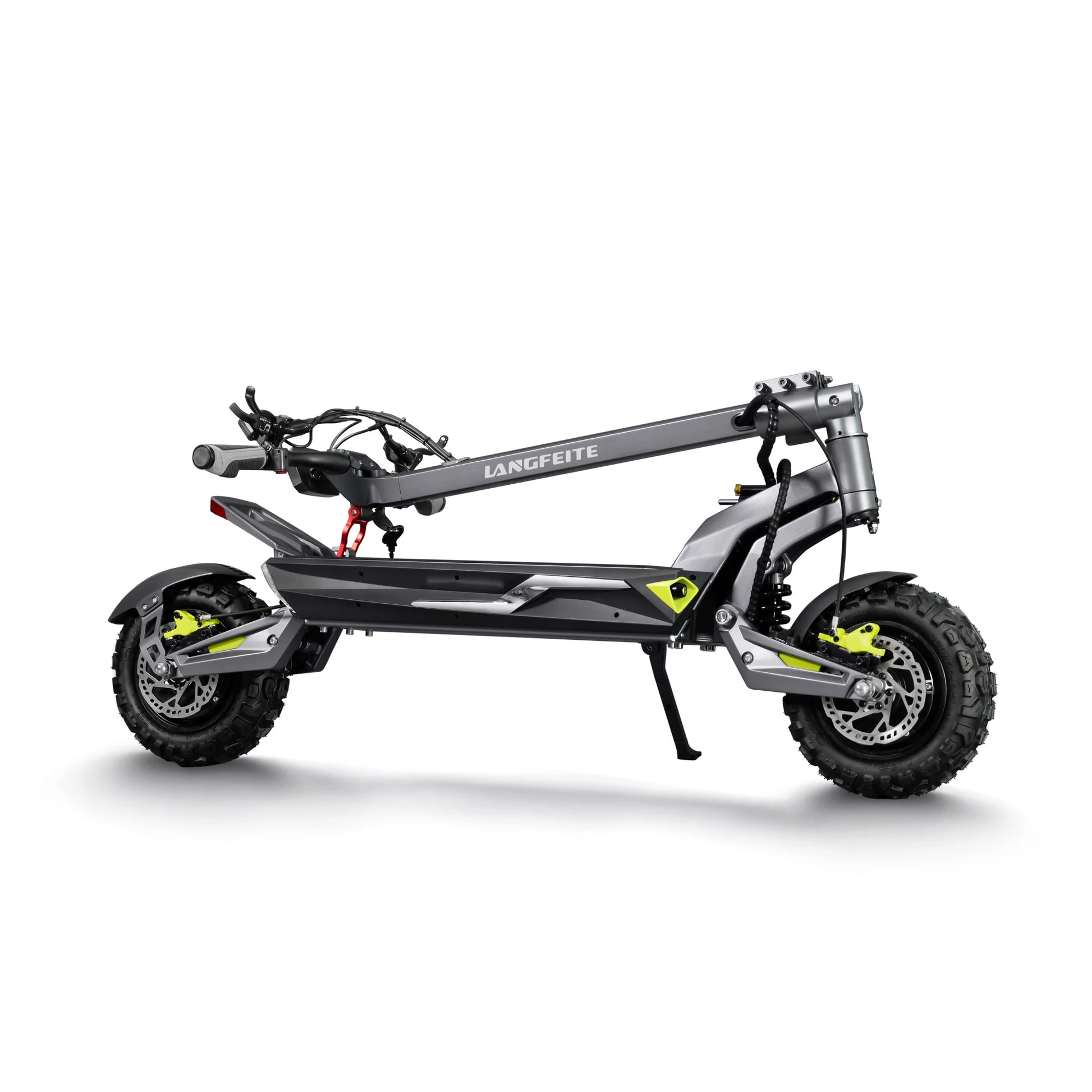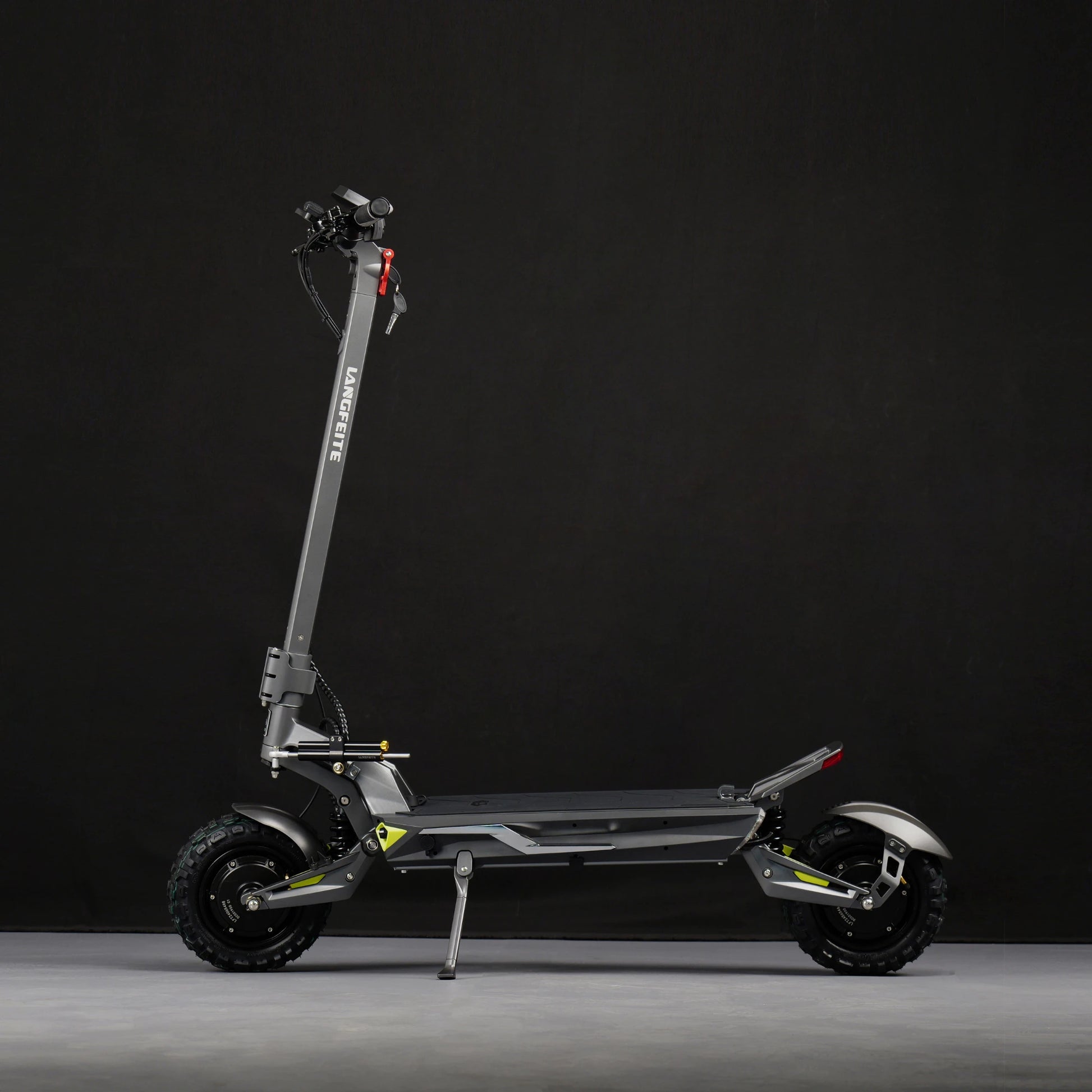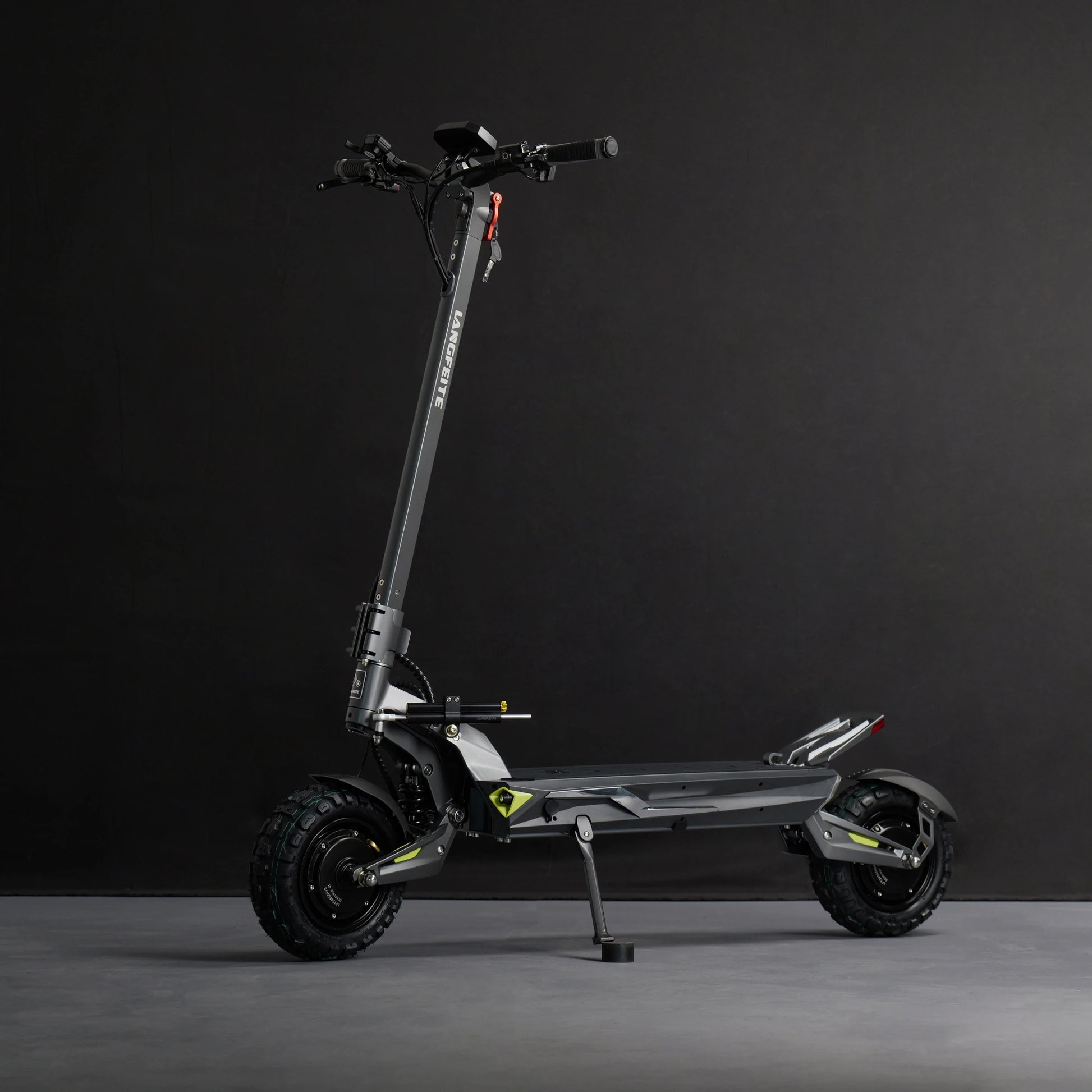 Udobje na prvem mestu. Langfeite C1 je opremljen s sprednjim in zadnjim hidravličnim vzmetenjem z vijačno vzmetjo (Hydraulic coil shock). Robustna nihajna roka in okvir iz enodelnega kovanega aluminija zagotavljata, da skiro učinkovito absorbira udarce in tresljaje, ne glede na to, ali se vozite po mestnih kockah ali gozdnih poteh.
