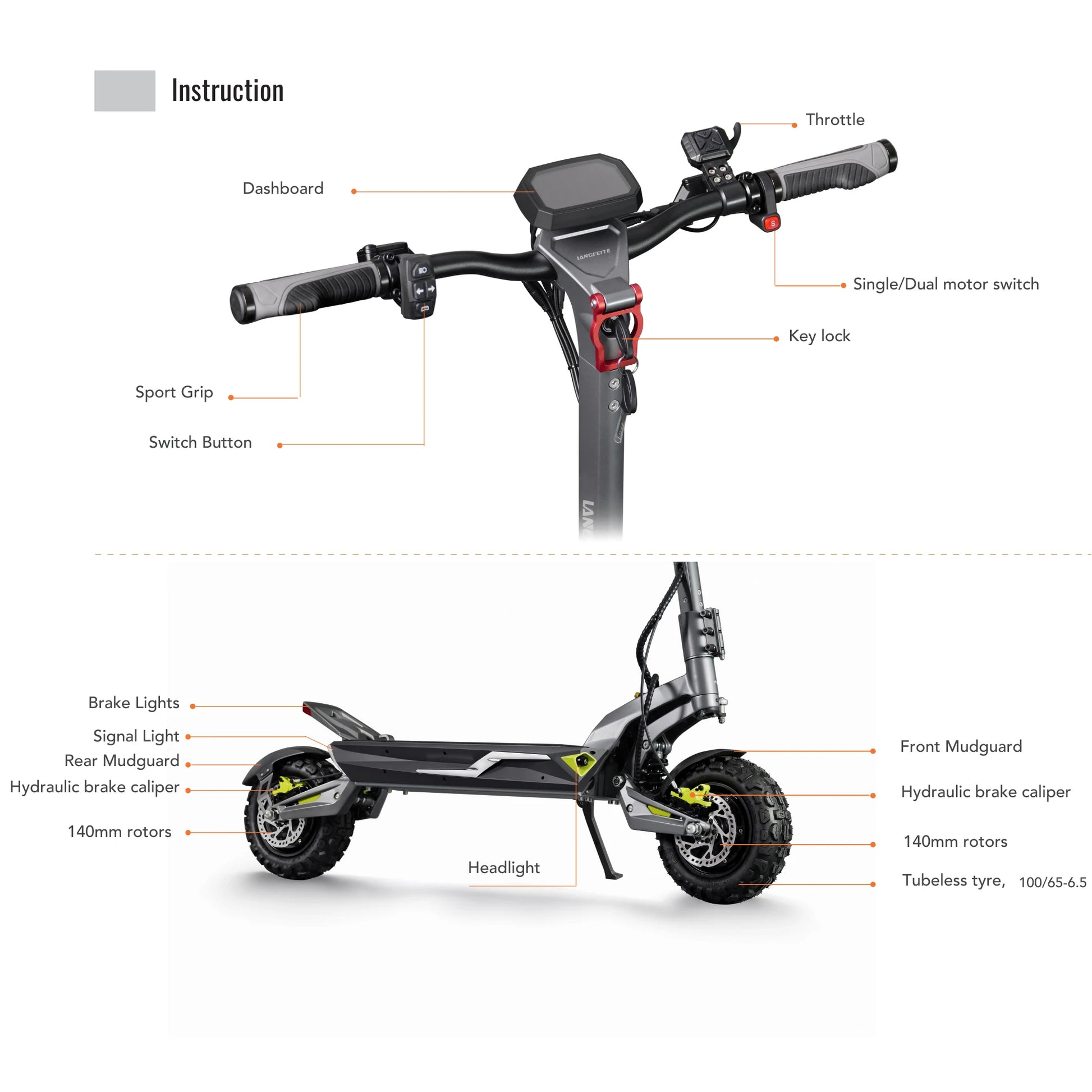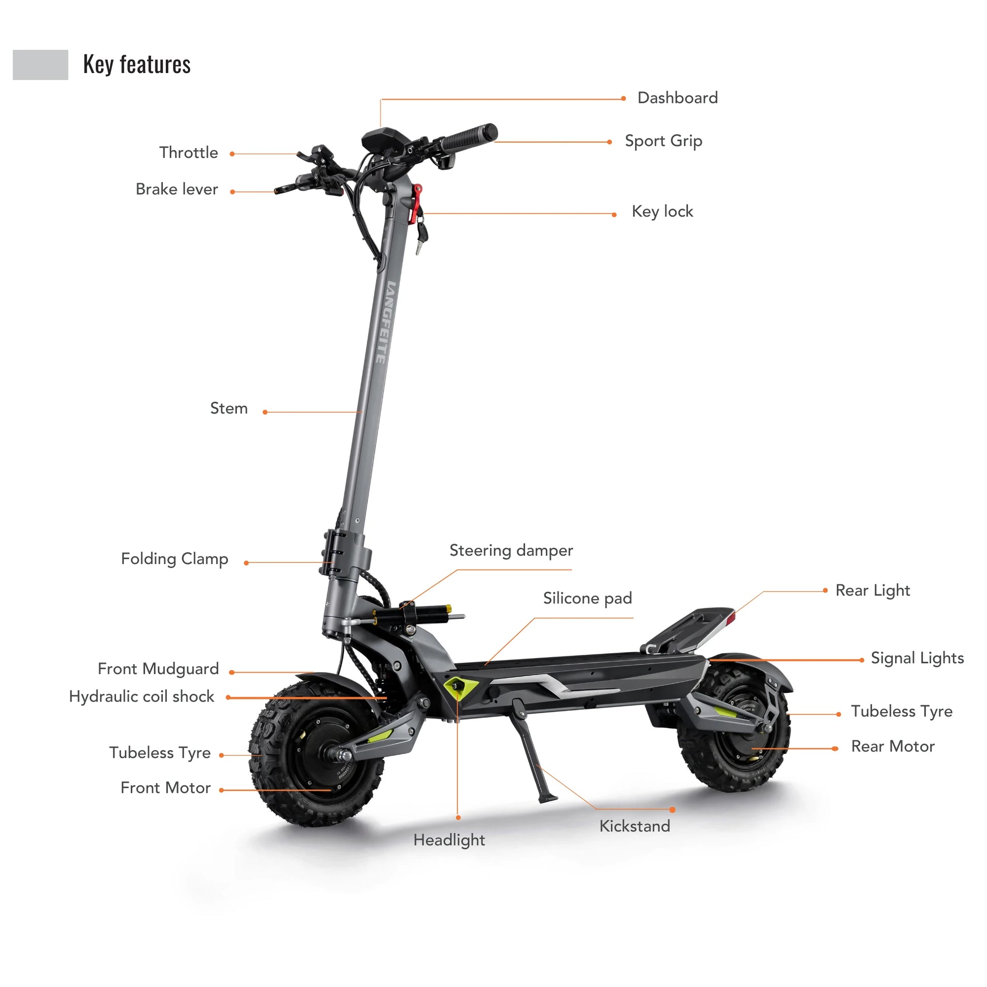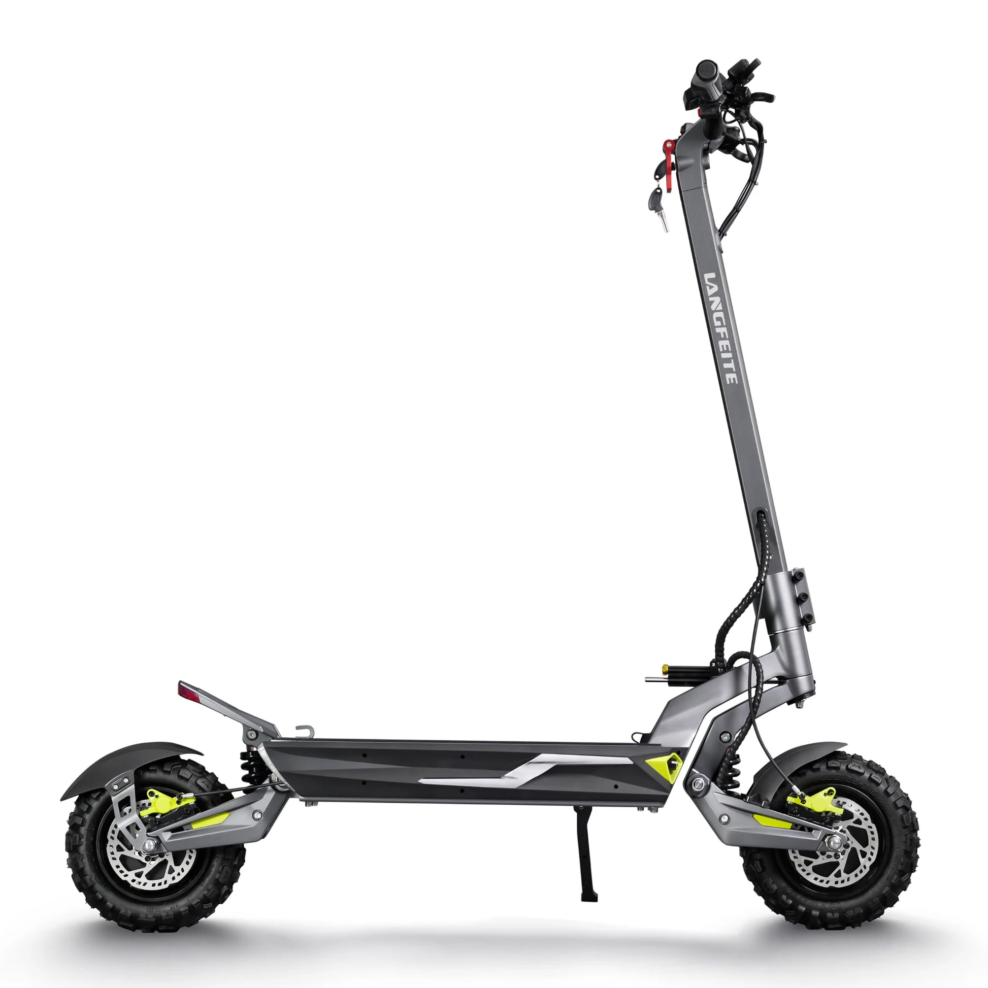 Udobje na prvem mestu. Langfeite C1 je opremljen s sprednjim in zadnjim hidravličnim vzmetenjem z vijačno vzmetjo (Hydraulic coil shock). Robustna nihajna roka in okvir iz enodelnega kovanega aluminija zagotavljata, da skiro učinkovito absorbira udarce in tresljaje, ne glede na to, ali se vozite po mestnih kockah ali gozdnih poteh.