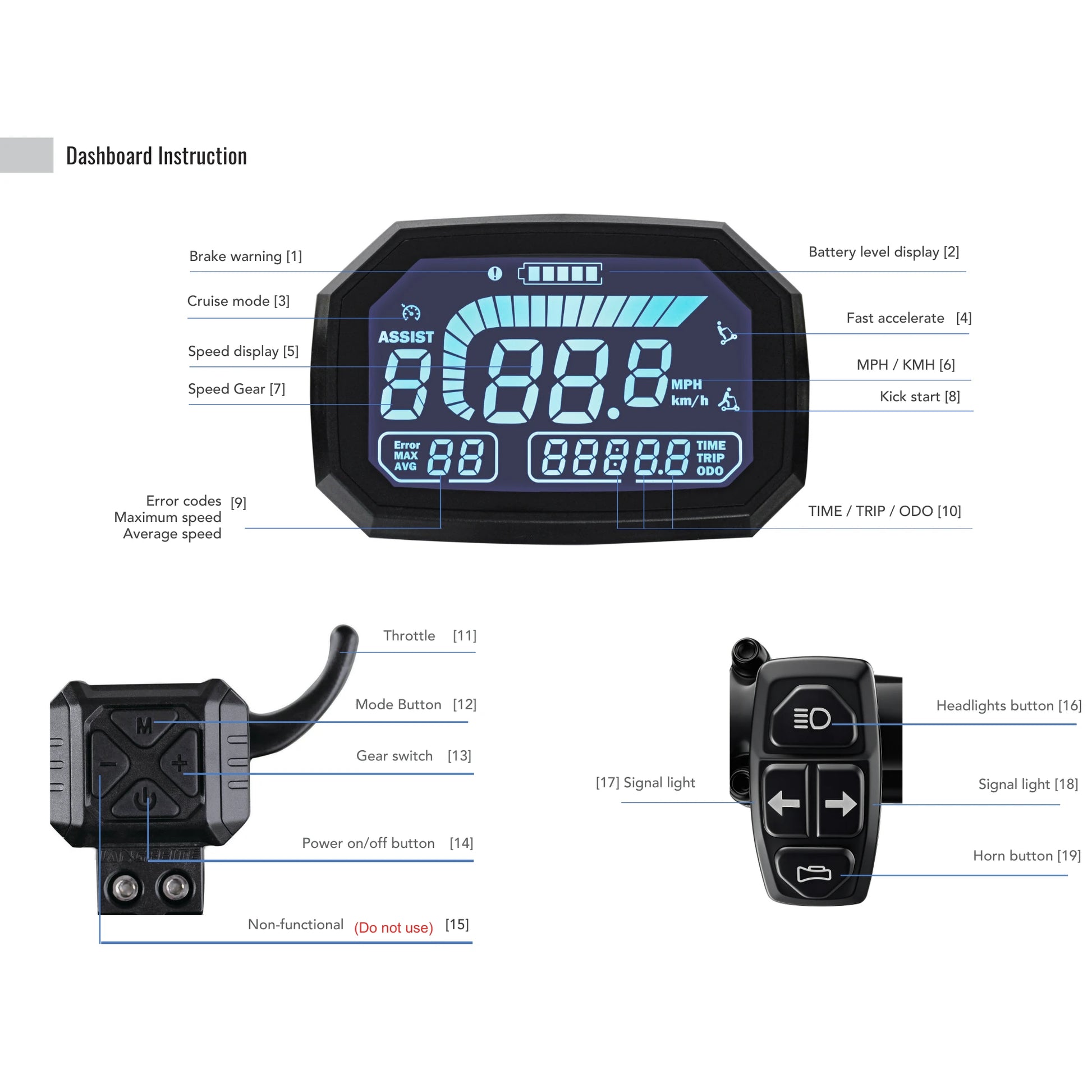 Na sredini krmila se nahaja velik barvni LCD zaslon, ki prikazuje vse ključne informacije: hitrost, stanje baterije, prevoženo pot in izbrano prestavo. Za dodatno varnost je skiro opremljen s fizično ključavnico (Key lock), ki preprečuje nepooblaščen vklop, na krmilu pa najdete tudi stikala za luči, smerokaze in hupo.