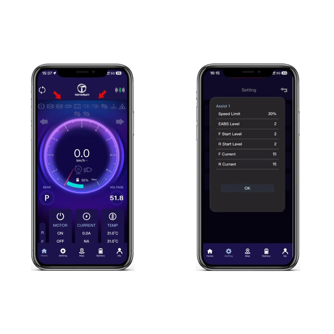 Prevzemite popoln nadzor s 4-inčnim TFT zaslonom in aplikacijo TEVERUN APP 1.5. Aplikacija omogoča GPS sledenje v realnem času, diagnostiko napak in prilagajanje nastavitev. Posebnost je sistem osvetlitve TEVERUN Lumina, ki ponuja več kot 1000 barvnih kombinacij in se samodejno prilagaja vožnji (zaviranju, zavijanju), kar povečuje vašo vidnost in varnost, hkrati pa skiroju daje unikaten videz.