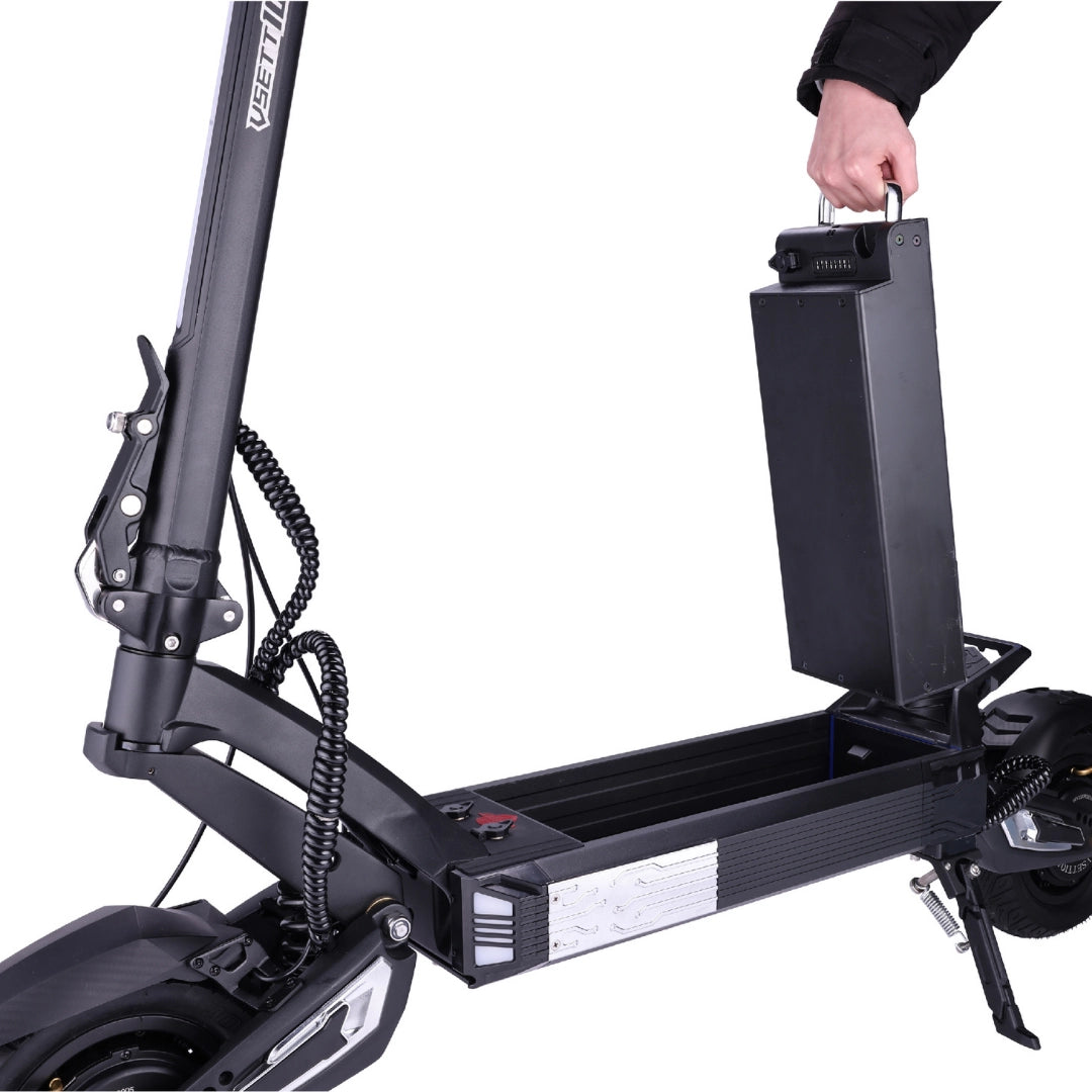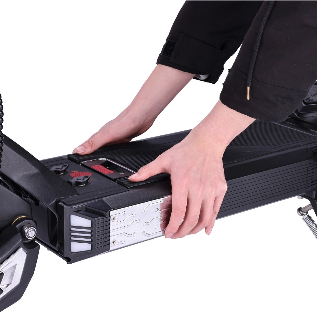 Ena izmed ključnih inovacij modela APEX je odstranljiva baterija. Ta prelomna zasnova omogoča polnjenje baterije ločeno od skiroja, kar je idealno za uporabnike v stanovanjih ali pisarnah. Izbirate lahko med različic z zmogljivo 60V 25.6Ah baterijo, ki ponuja doseg do 110 km. Dvojna polnilna vhoda pa omogočata bistveno krajši čas polnjenja.