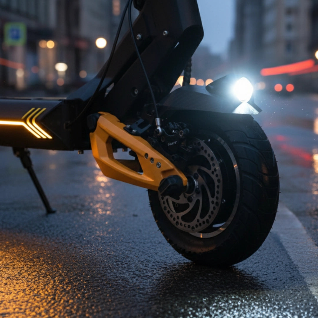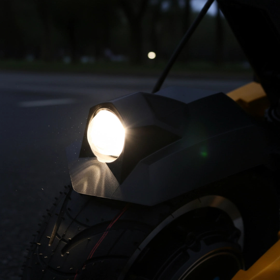 Bodite vidni in varni v vseh svetlobnih pogojih. Skiro ima celovit sistem osvetlitve, ki vključuje dvojno LED prednjo luč, zadnjo luč in zavorne luči. Posebnost so vgrajeni smerni kazalci spredaj in zadaj, ki jih enostavno upravljate z intuitivnimi gumbi na krmilu. S tem sistemom boste v prometu vedno jasno izrazili svoje namere in poskrbeli za varno vožnjo podnevi in ponoči.