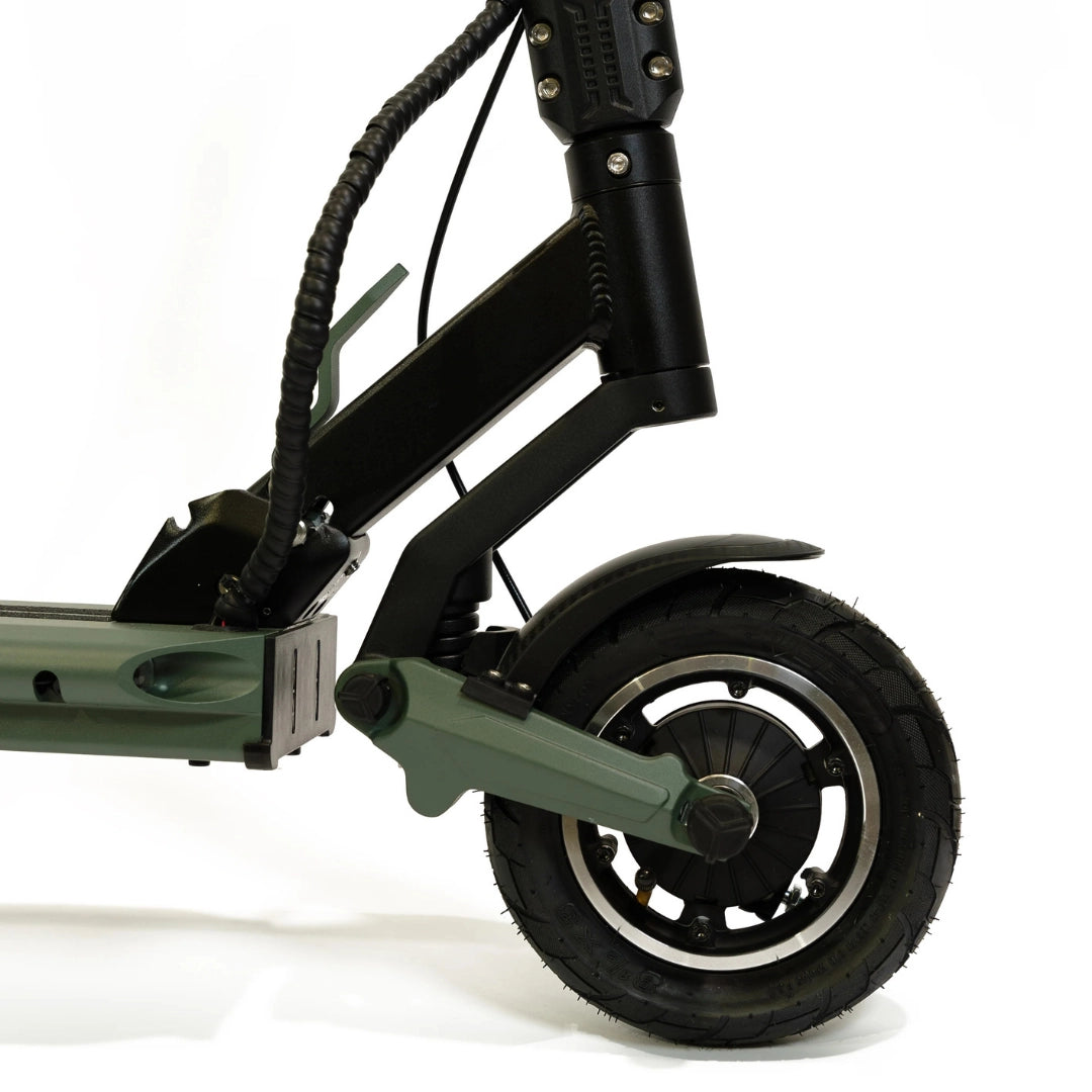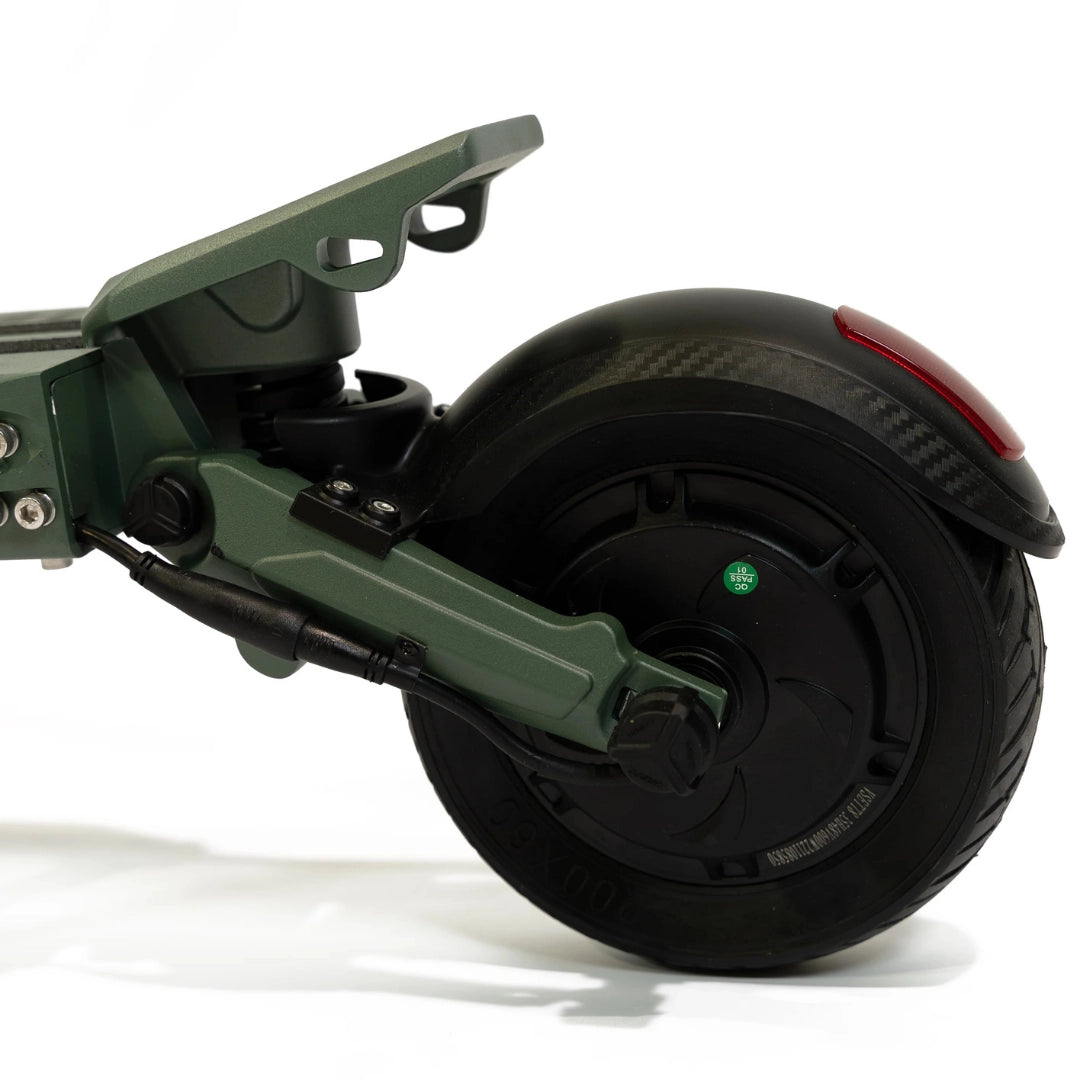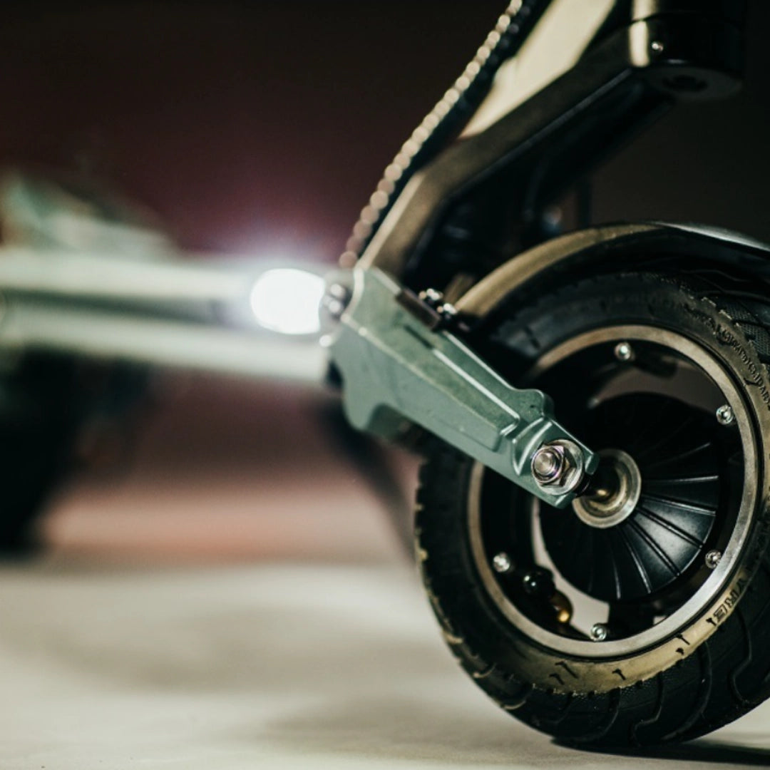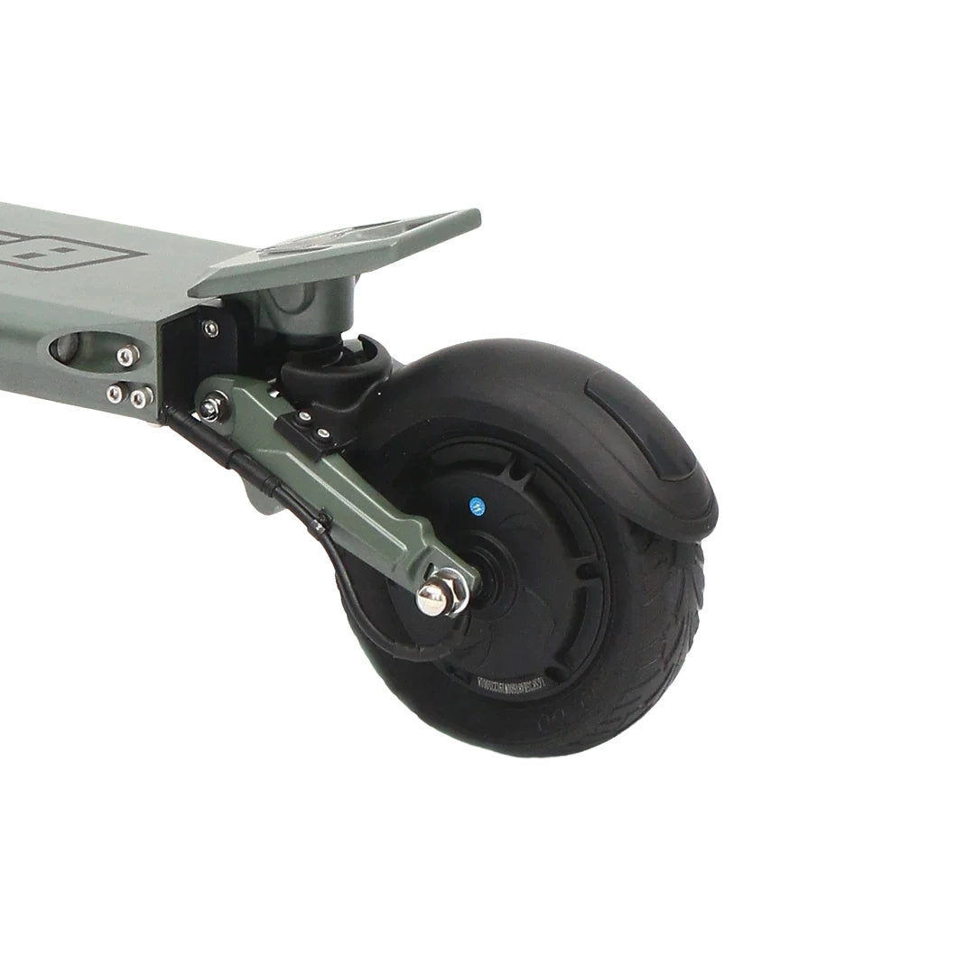 Premišljena kombinacija pnevmatik zagotavlja optimalno ravnovesje med udobjem in praktičnostjo. Sprednja 8.5-inčna pnevmatska (napihljiva) pnevmatika odlično absorbira manjše neravnine in prispeva k udobnejši vožnji, medtem ko zadnja 8-inčna polna (trdna) pnevmatika zagotavlja vzdržljivost in odpornost proti predrtju.