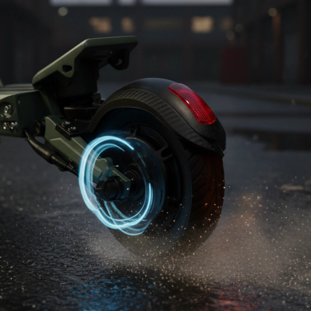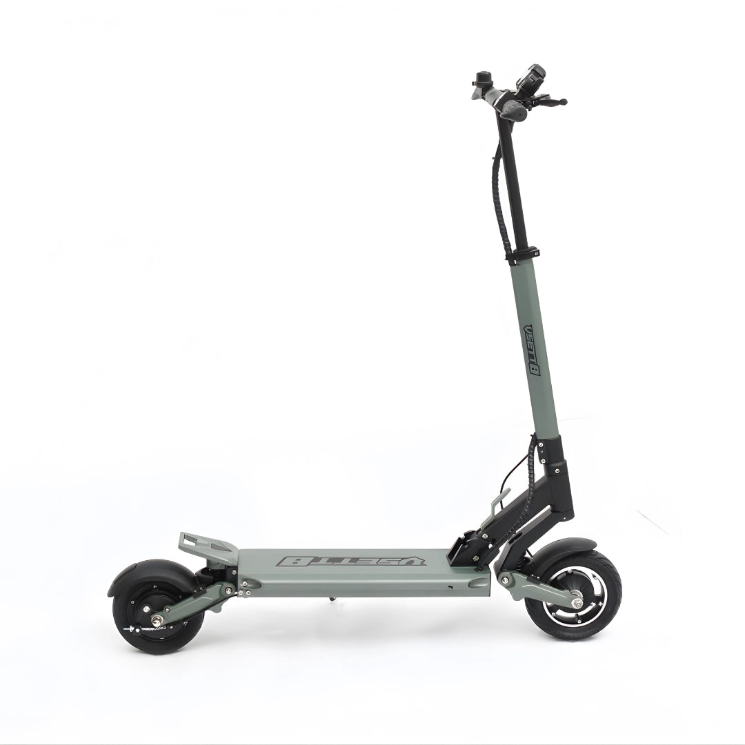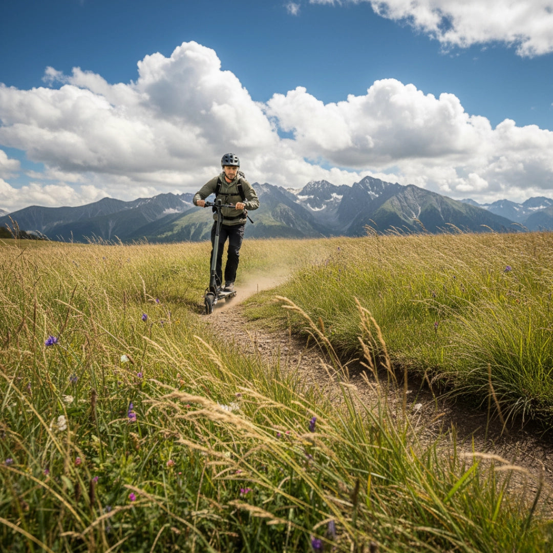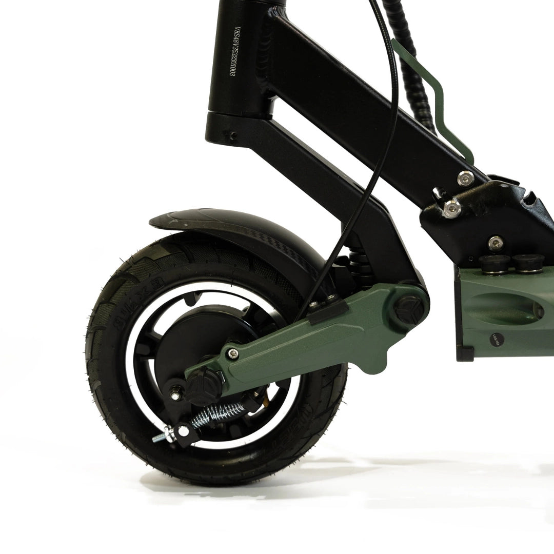 Premišljena kombinacija pnevmatik zagotavlja optimalno ravnovesje med udobjem in praktičnostjo. Sprednja 8.5-inčna pnevmatska (napihljiva) pnevmatika odlično absorbira manjše neravnine in prispeva k udobnejši vožnji, medtem ko zadnja 8-inčna polna (trdna) pnevmatika zagotavlja vzdržljivost in odpornost proti predrtju.