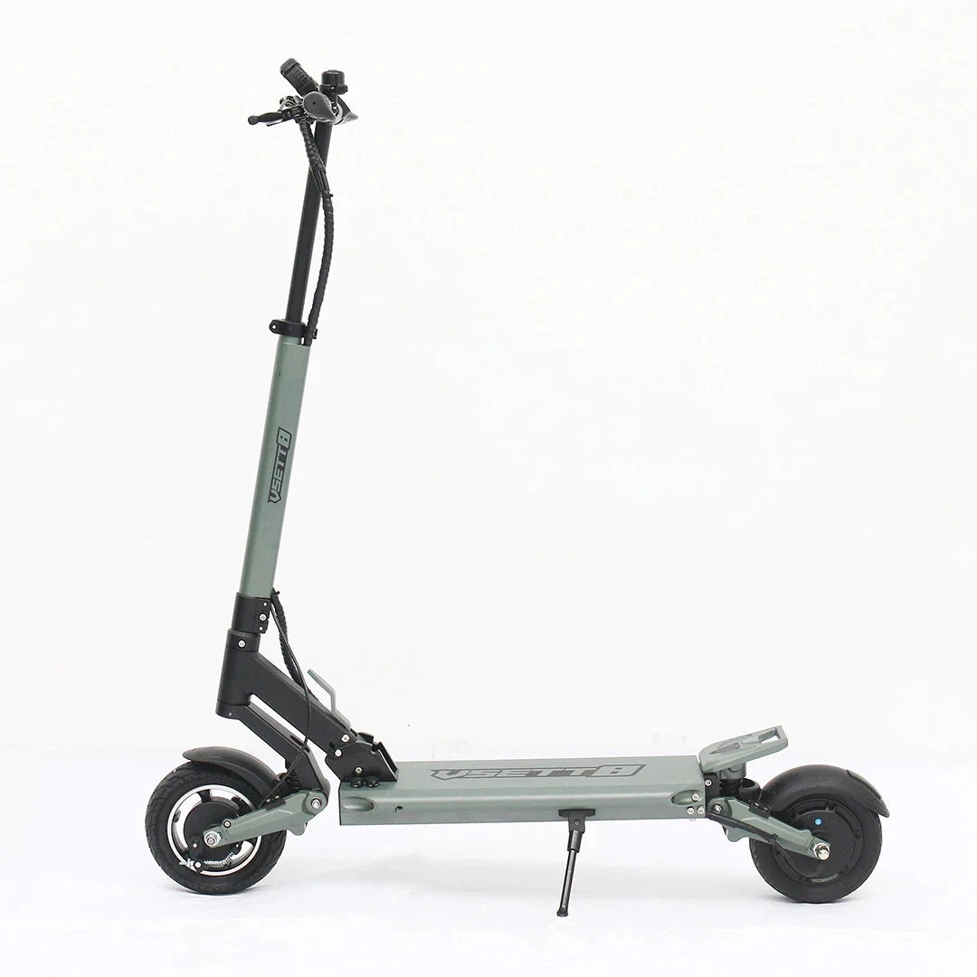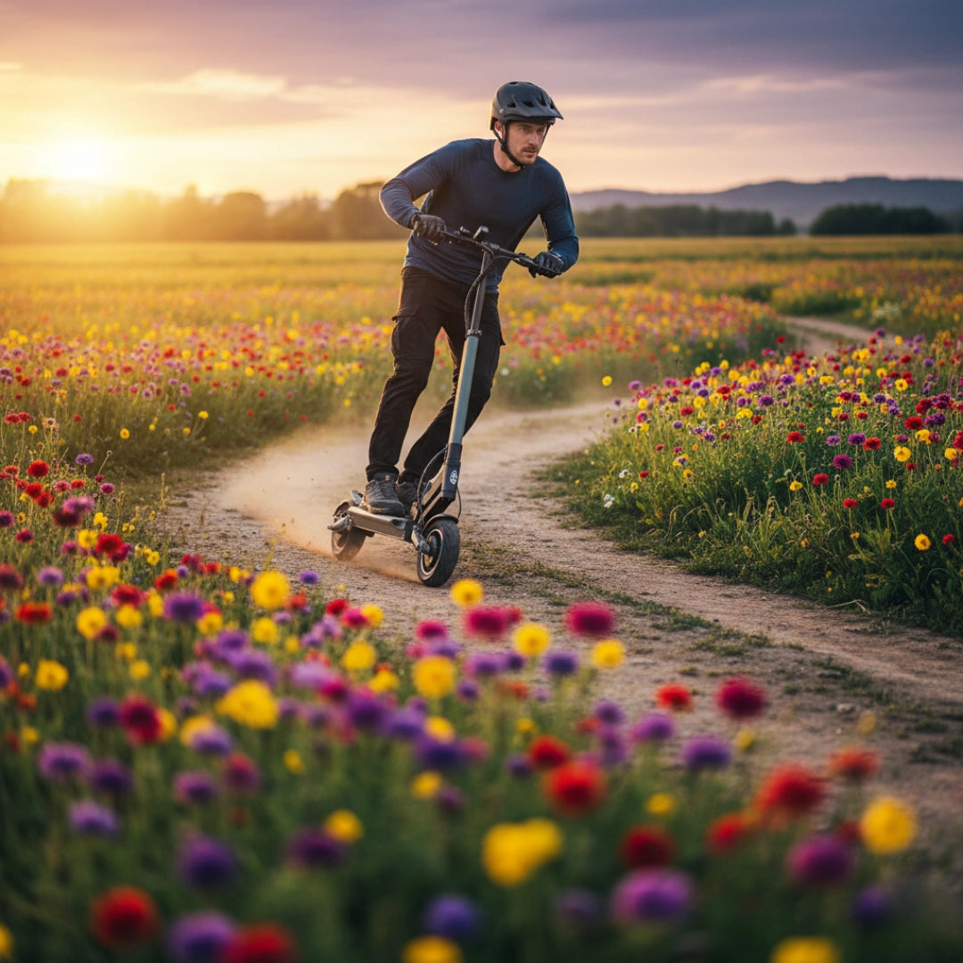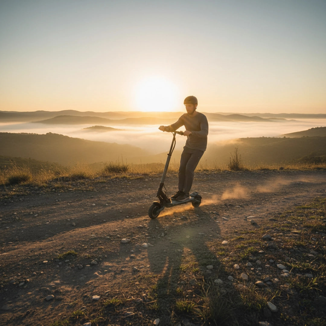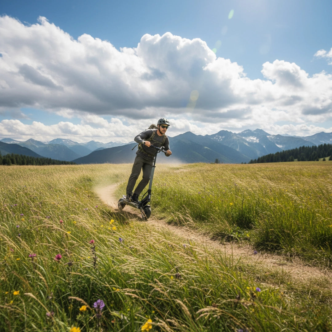 Premišljena kombinacija pnevmatik zagotavlja optimalno ravnovesje med udobjem in praktičnostjo. Sprednja 8.5-inčna pnevmatska (napihljiva) pnevmatika odlično absorbira manjše neravnine in prispeva k udobnejši vožnji, medtem ko zadnja 8-inčna polna (trdna) pnevmatika zagotavlja vzdržljivost in odpornost proti predrtju.