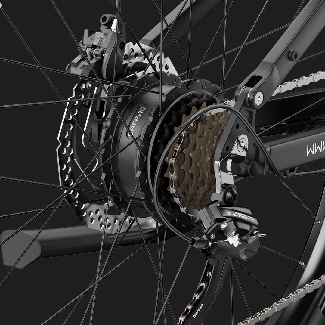 Menjalniški sistem Shimano Tourney 2×7 zagotavlja gladko in natančno prestavljanje ter dolgotrajno vzdržljivost. Kolo je opremljeno tudi s pametnim senzorjem navora, ki natančno prilagaja moč motorja glede na vaš pritisk na pedala. To zagotavlja naraven občutek pomoči, izboljša učinkovitost in podaljša doseg baterije.
