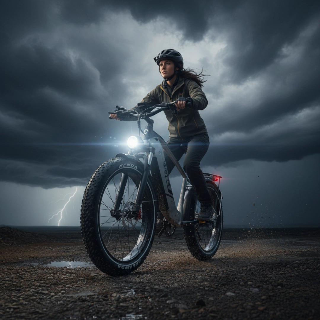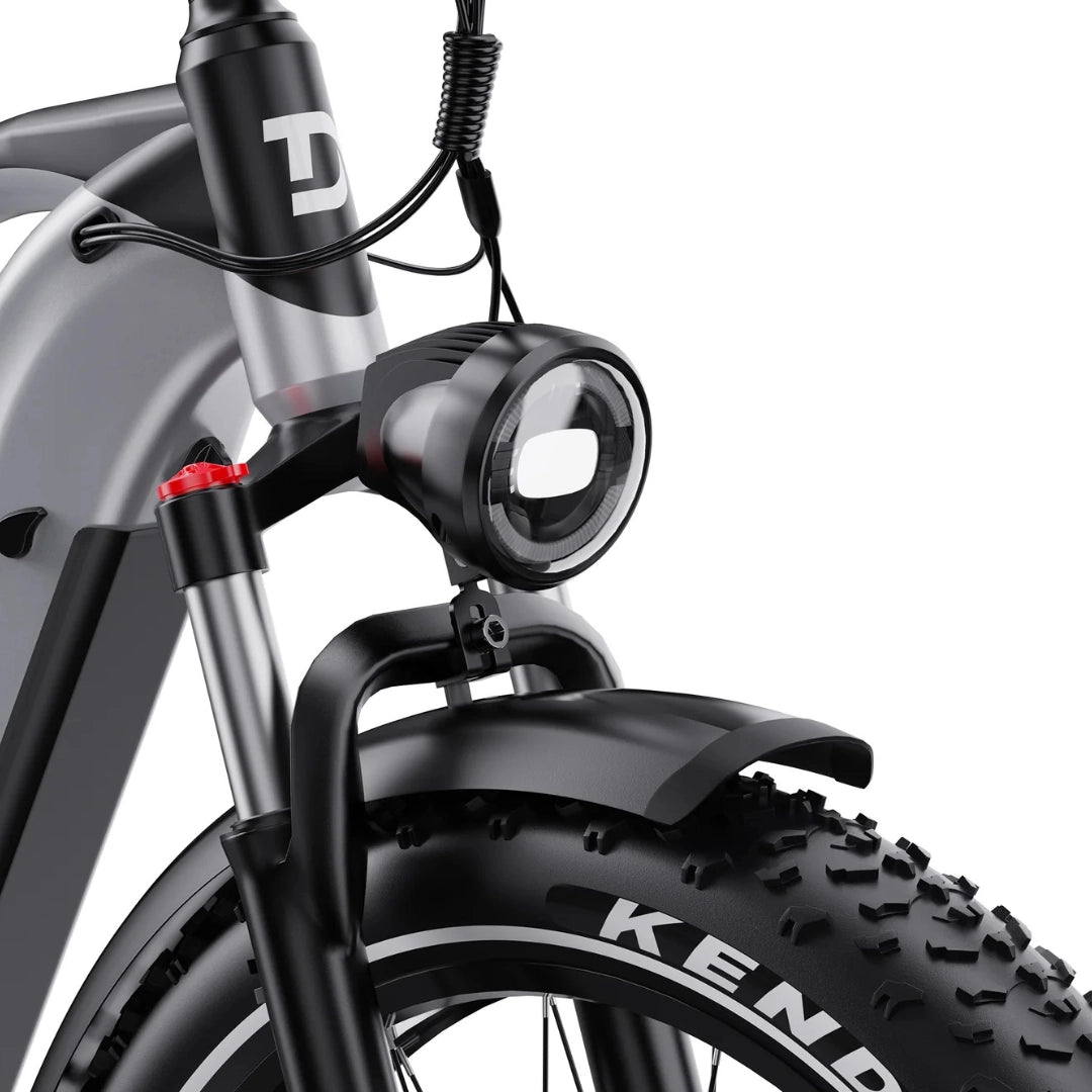 Opremljen je s širokimi 26×4.0 palčnimi pnevmatikami Kenda, ki izboljšujejo ravnotežje in stabilnost na vseh terenih. Ne glede na to, ali se vozite po mestnem asfaltu, makadamu ali gozdnih poteh, te pnevmatike zagotavljajo odličen oprijem in udobno vožnjo, saj struktura 30 TPI združuje vzdržljivost in udobje.