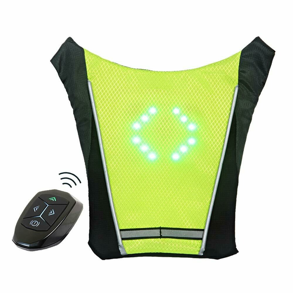 Varnostni jopič z utripajočimi smerniki ima vgrajene LED indikatorje in namensko stikalo na hrbtu, kar vam omogoča, da jasno in varno signalizirate svoje zavoje drugim udeležencem v prometu.
